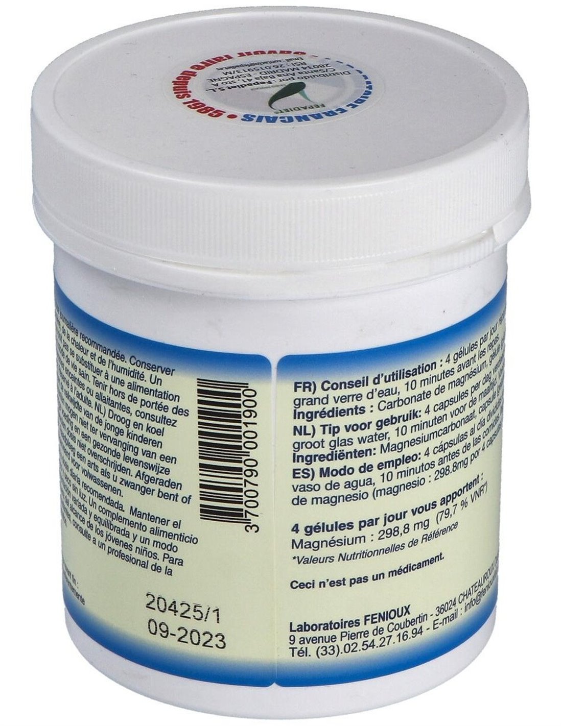 Este producto de Fenioux es un complemento alimenticio. Se trata de 200 cápsulas blandas hechas de gelatina y rellenas de magnesio y carbonato de magnesio. Este último contribuye al correcto desempeño del sistema nervioso y del cuerpo en general. Alivia el cansancio persistente y regula el equilibrio electrolítico del cuerpo humano. Además, este complemento potencia el proceso de división celular y la síntesis proteica natural. Igualmente, ayuda a mantener sanos los músculos, dientes y huesos.
