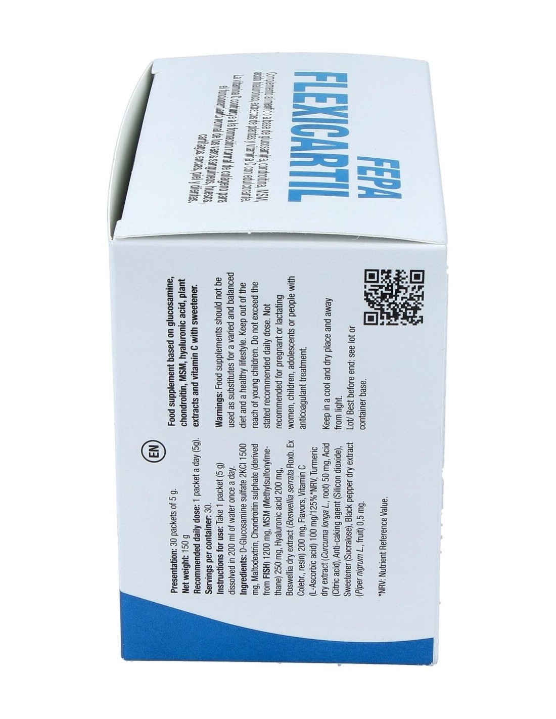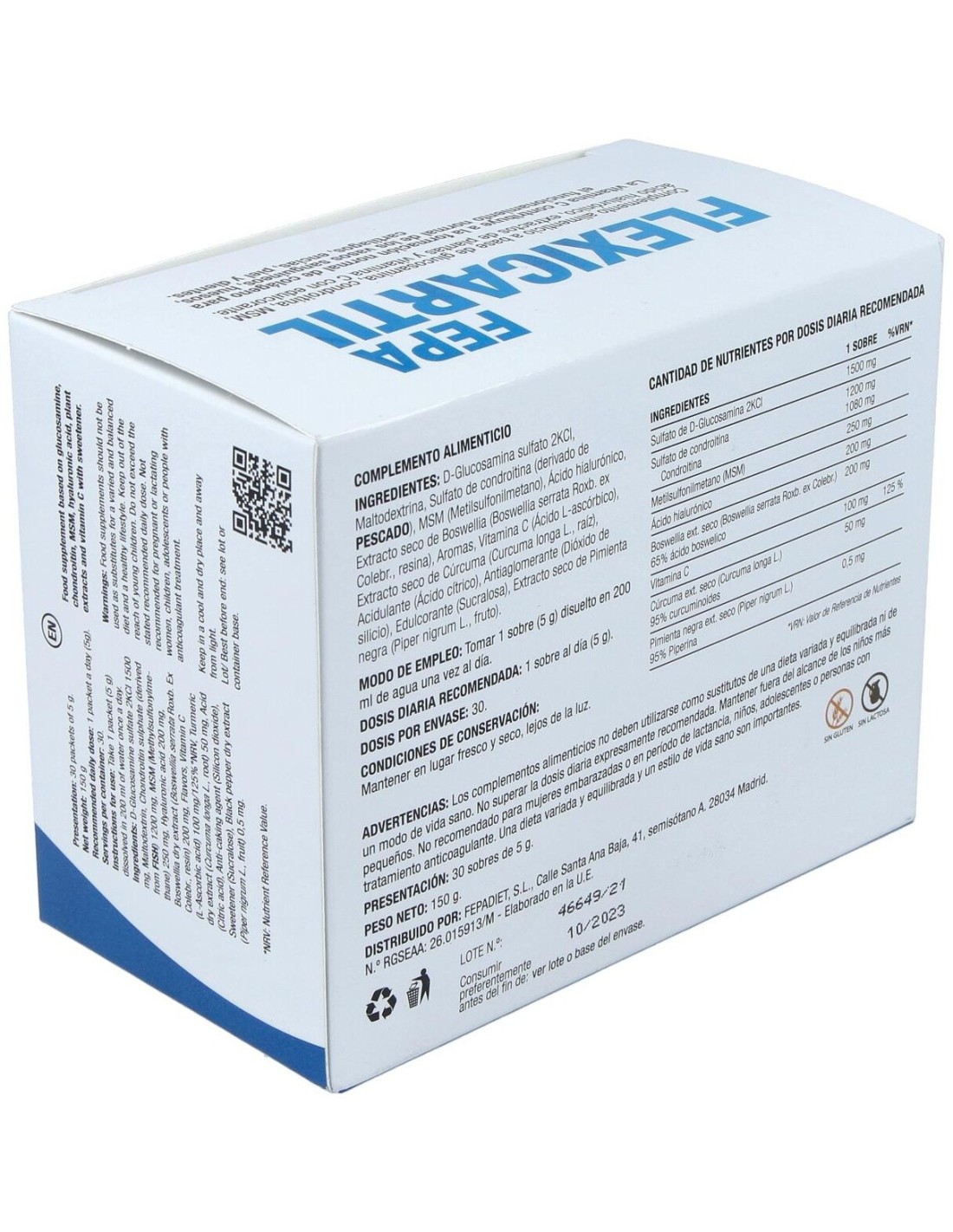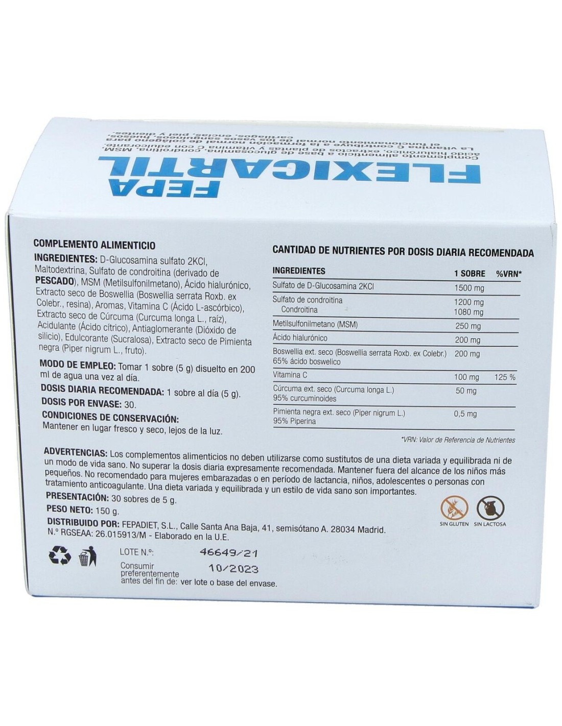 D-Glucosamina sulfato 2KCl, Maltodextrina, Sulfato de condroitina (derivado de pescado), MSM (Metilsulfonilmetano), Ácido hialurónico (Hialuronato sódico), Extracto seco de Boswellia (Boswellia serrata Roxb. ex Colebr., resina), Aromas, Vitamina C (Ácido L-ascórbico), Extracto seco de Cúrcuma (Curcuma longa L., raíz), Acidulante (Ácido cítrico), Antiaglomerante (Dióxido de silicio), Edulcorante (Sucralosa), Extracto seco de Pimienta negra (Piper nigrum L., fruto).
