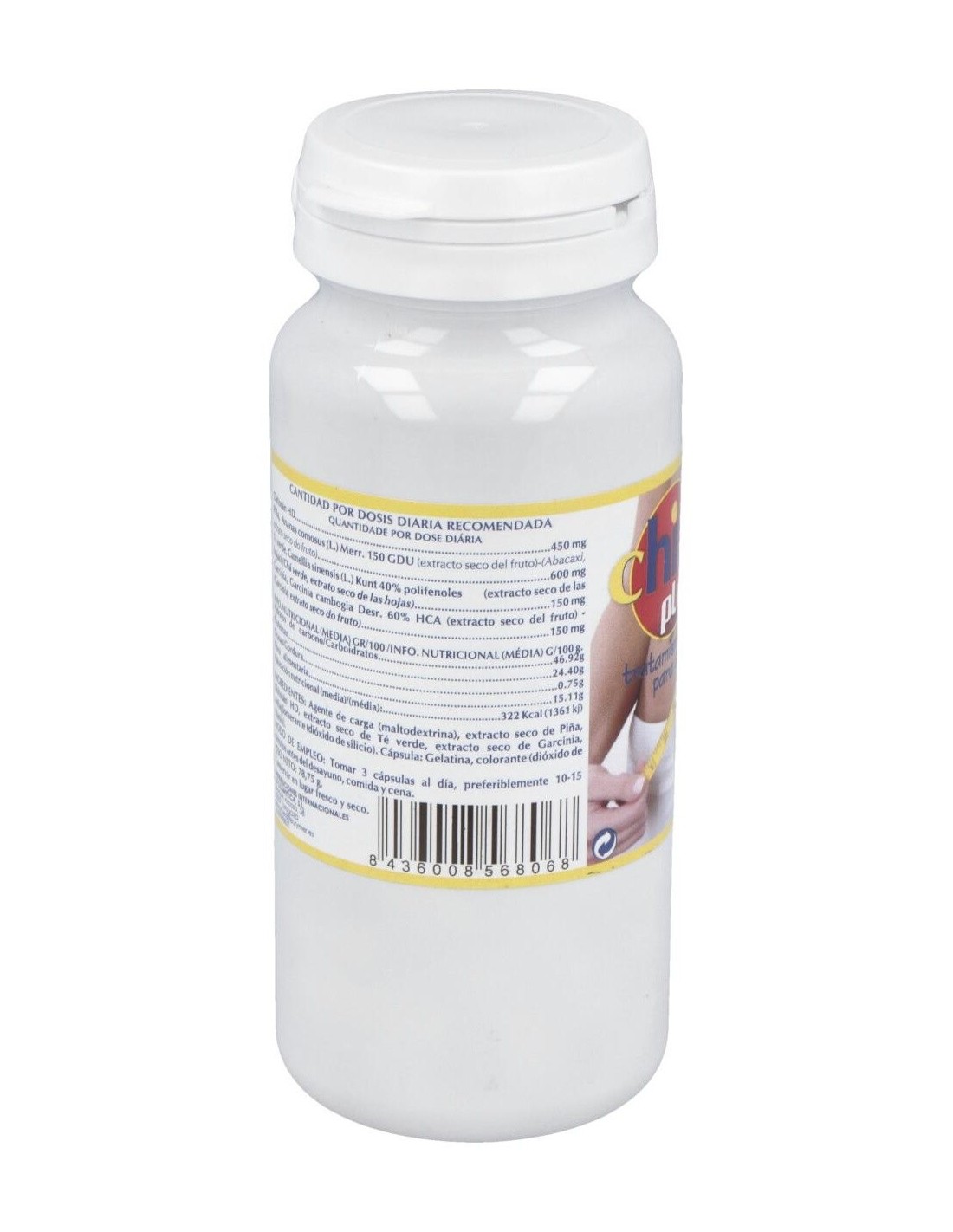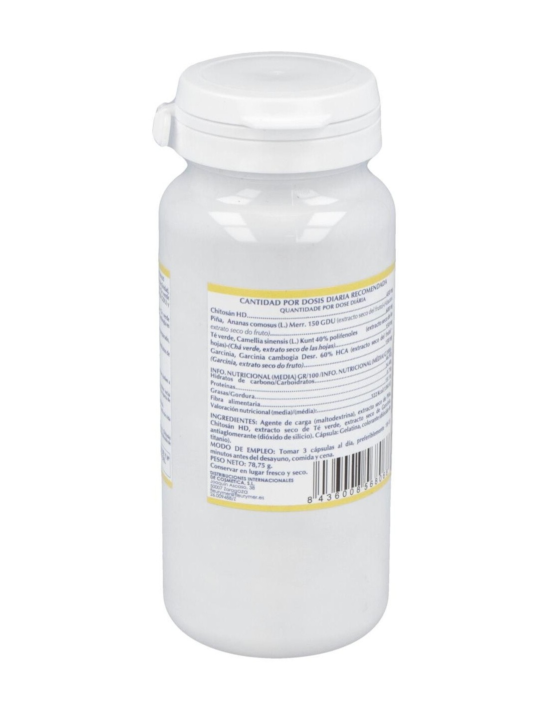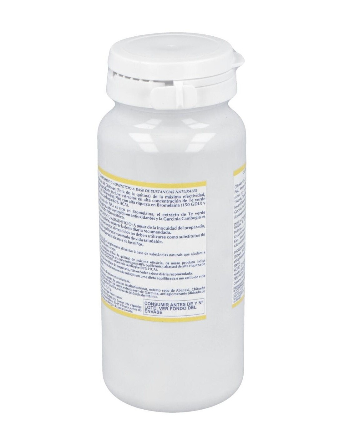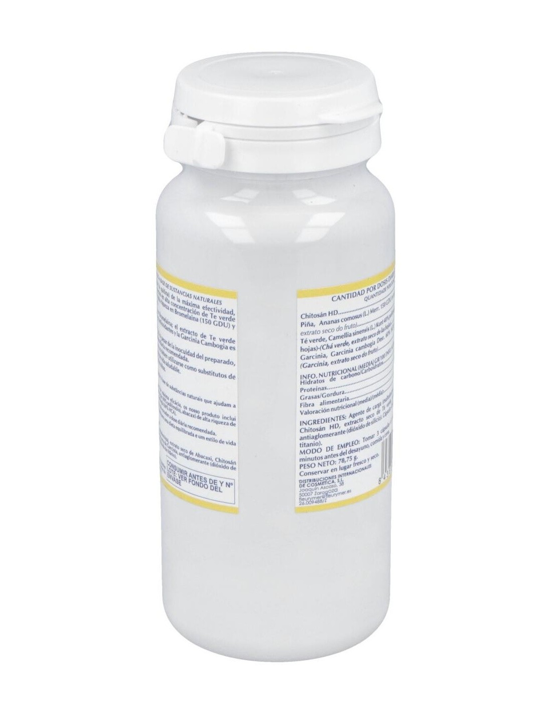 Chitosán, extractos en alta concentración de Té verde (40% de Polifenoles) , Piña con alta riqueza en Bromelina (150 GDU) y Garcinia cambogia (60% HCA).