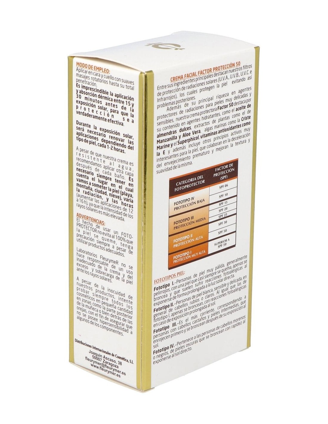 Fleurymer Crema Solar Facial SPF50 80ml es una cema solar para rostro de muy alta protección solar SPF50 y con protección de rayos solares U.V.A., U.V.B., U.V.C. e Infrarrojos.