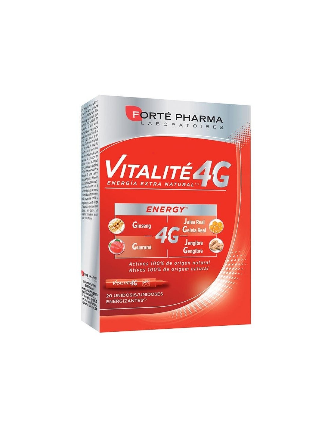 Forté Pharma Vitalité 4G Energy Unidosis 20uds es un suplemento que aporta energía de origen natural gracias a su complejo 4G, que incluye ginseng, guaraná, jalea real y jengibre. Ayuda a reducir el cansancio y la fatiga y contribuye al bienestar del organismo.