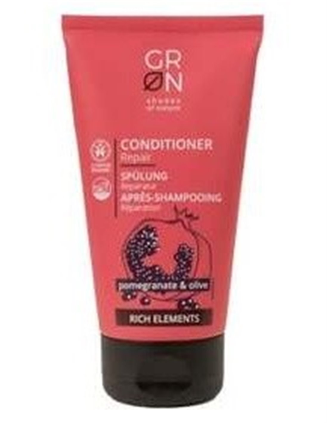 Acondicionador reparador con extracto de granada y aceite de oliva para conseguir un cabello hidratado y nutrido. Fórmula vegana. Producto certificado Cosmos Organic.