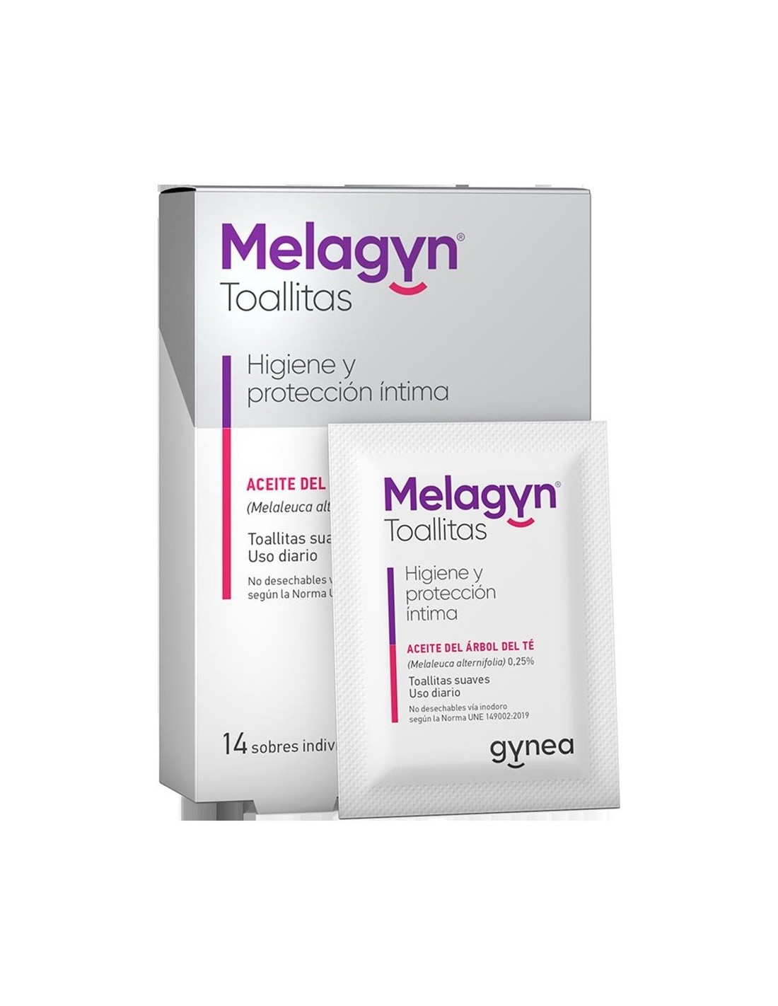 Melagyn® Toallitas 14 sobres son unas toallitas especialmente diseñadas para la higiene íntima de la mujer. Su fórmula contiene una solución al 0,25% de melaleuca alternifolia (aceite esencial de árbol del té). Poseen un pH 8,5 que no altera el pH vaginal y que genera una pantalla protectora previniendo el crecimiento de hongos. Estas prácticas toallitas permiten en la mujer la máxima la higiene íntima, sin aclarado en cualquier lugar y momento, aportando una sensación de bienestar, frescor y confort. Además, poseen un agradable olor natural de eucalipto que le confiere las propiedades de un desodorante natural.