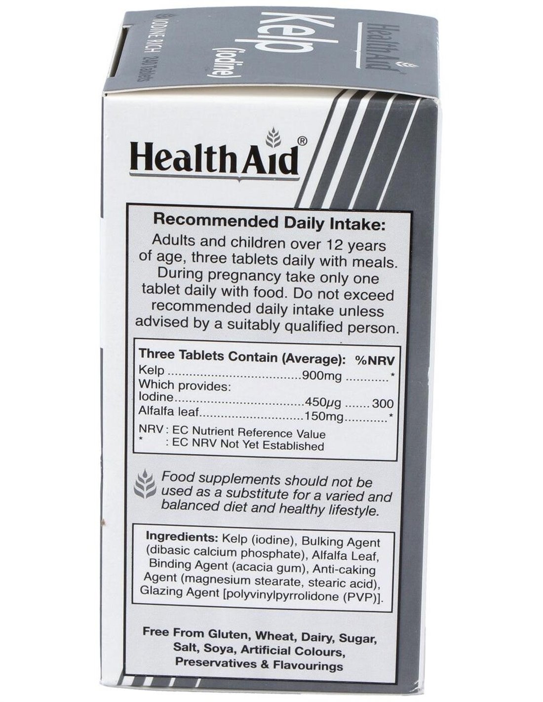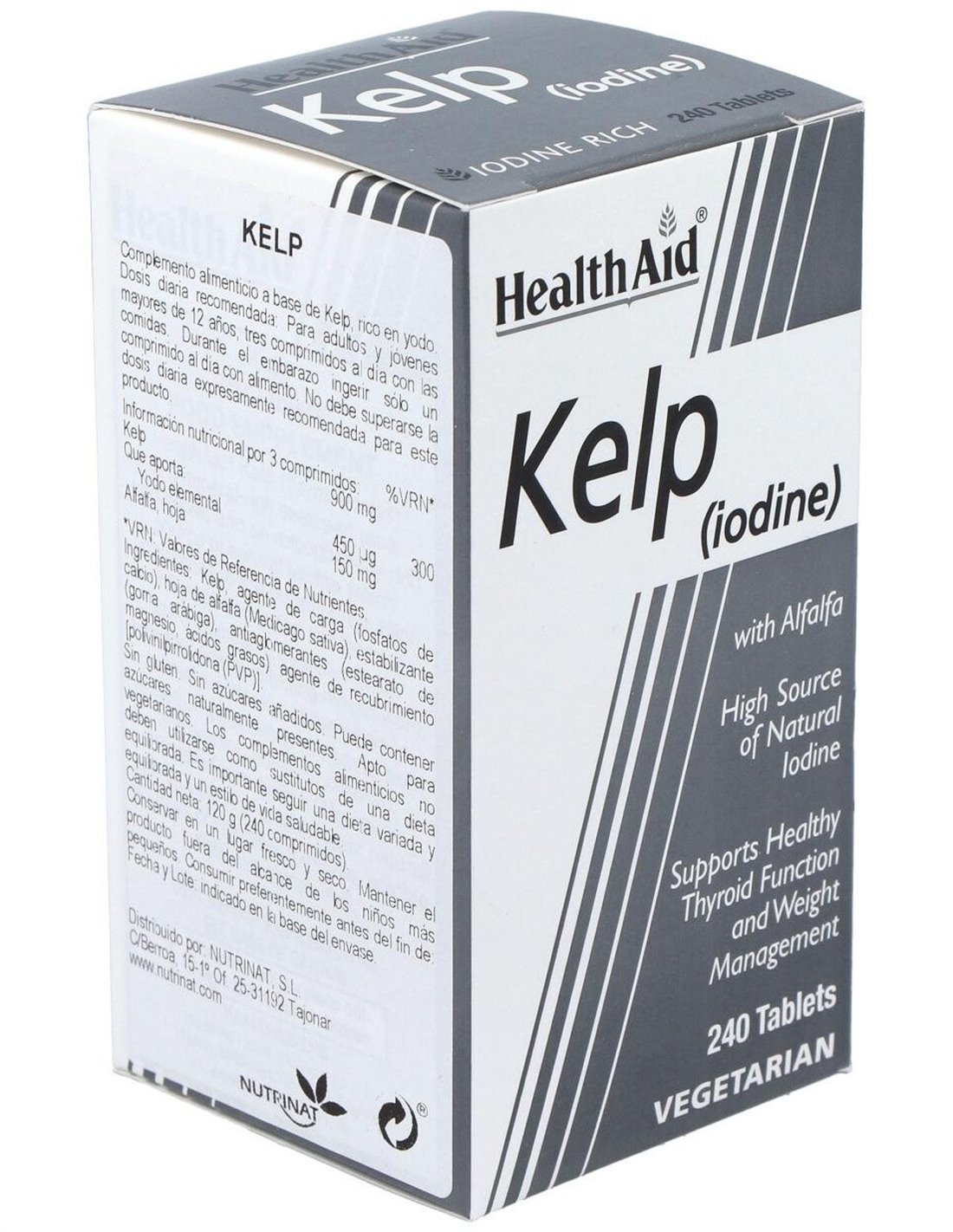 Suplemento nutricional a base de kelp, rico en yodo. El yodo contribuye a la producción normal de hormonas tiroideas y a la función tiroidea normal, al funcionamiento normal del sistema nervioso y al mantenimiento de la piel en condiciones normales, a la función cognitiva y al metabolismo energético normal. Apto para vegetarianos.