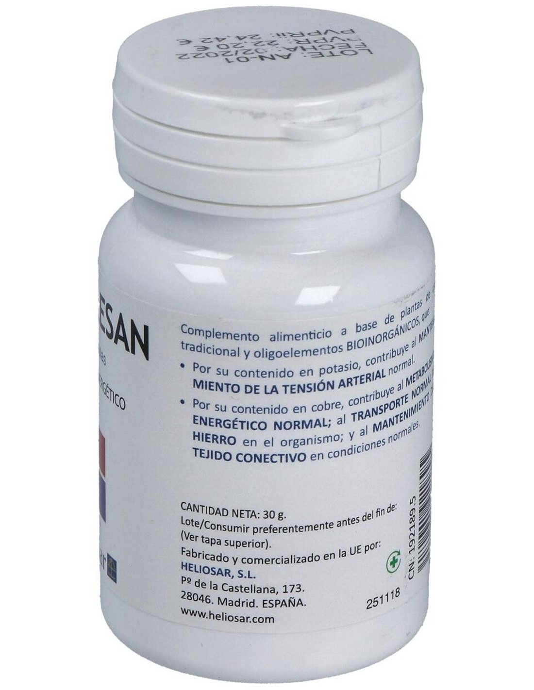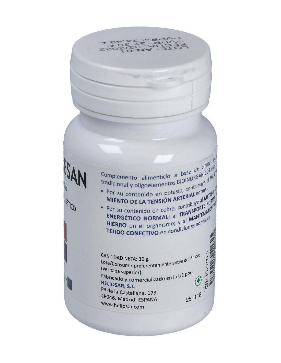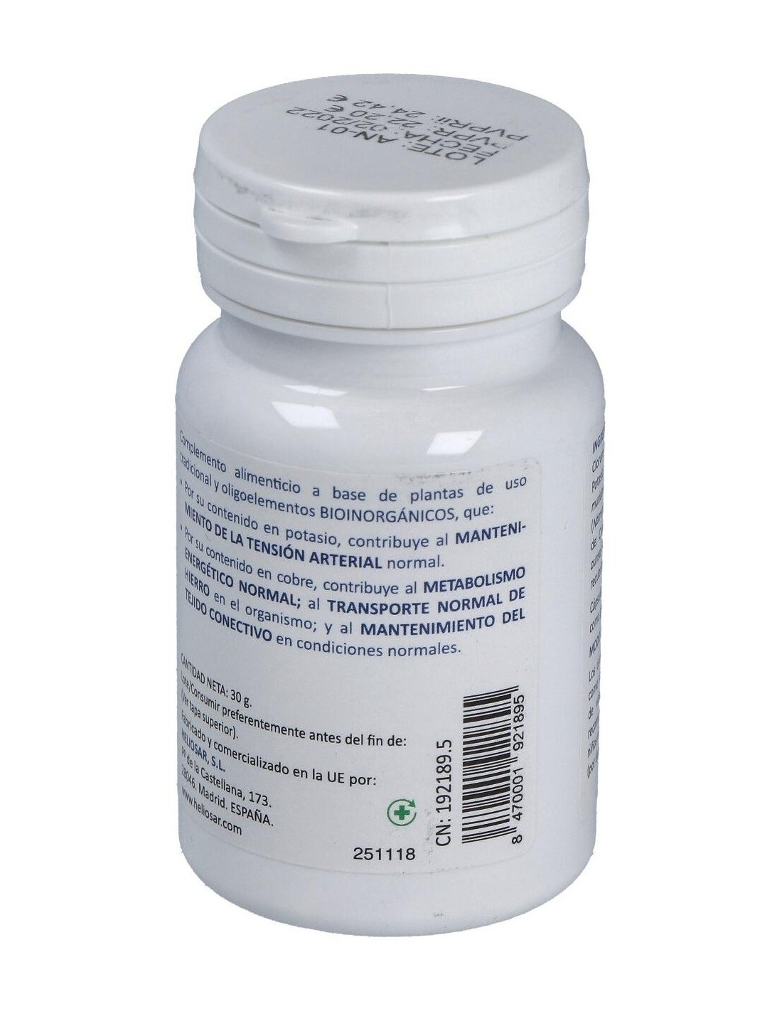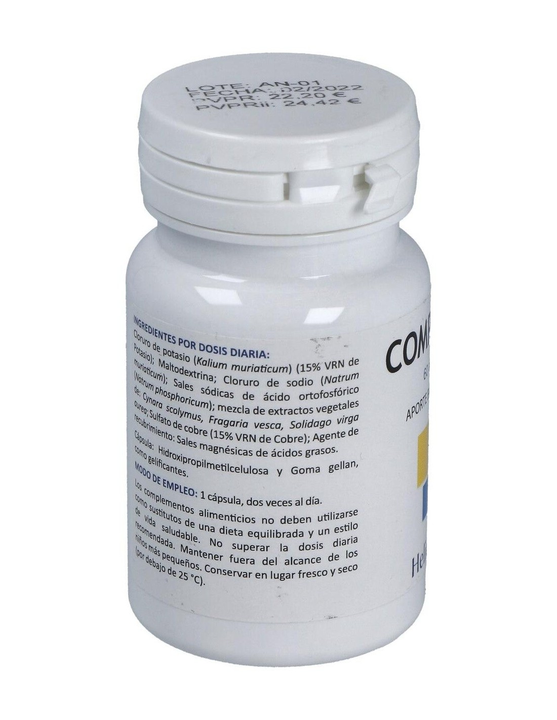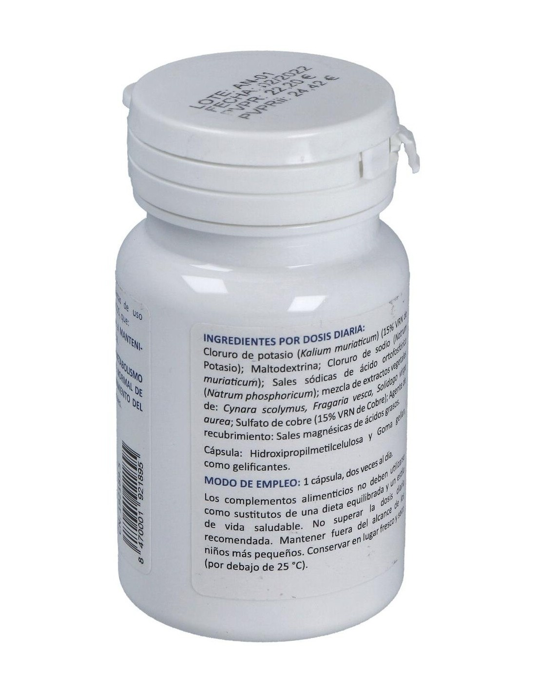Cloruro de potasio (Kalium muriaticum) (15% VRN de Potasio): Maltodextrina: Cloruro de sodio (Natrum muriaticum): Sales sódicas de ácido ortofosfórico (Natrum phosphoricum): mezcla de extractos vegetales de: Cynara scolymus, Fragaria vesca, Solidago virga aurea: Sulfato de cobre (15% VRN de Cobre): Agente de recubrimiento: Sales magnésicas de ácidos grasos.