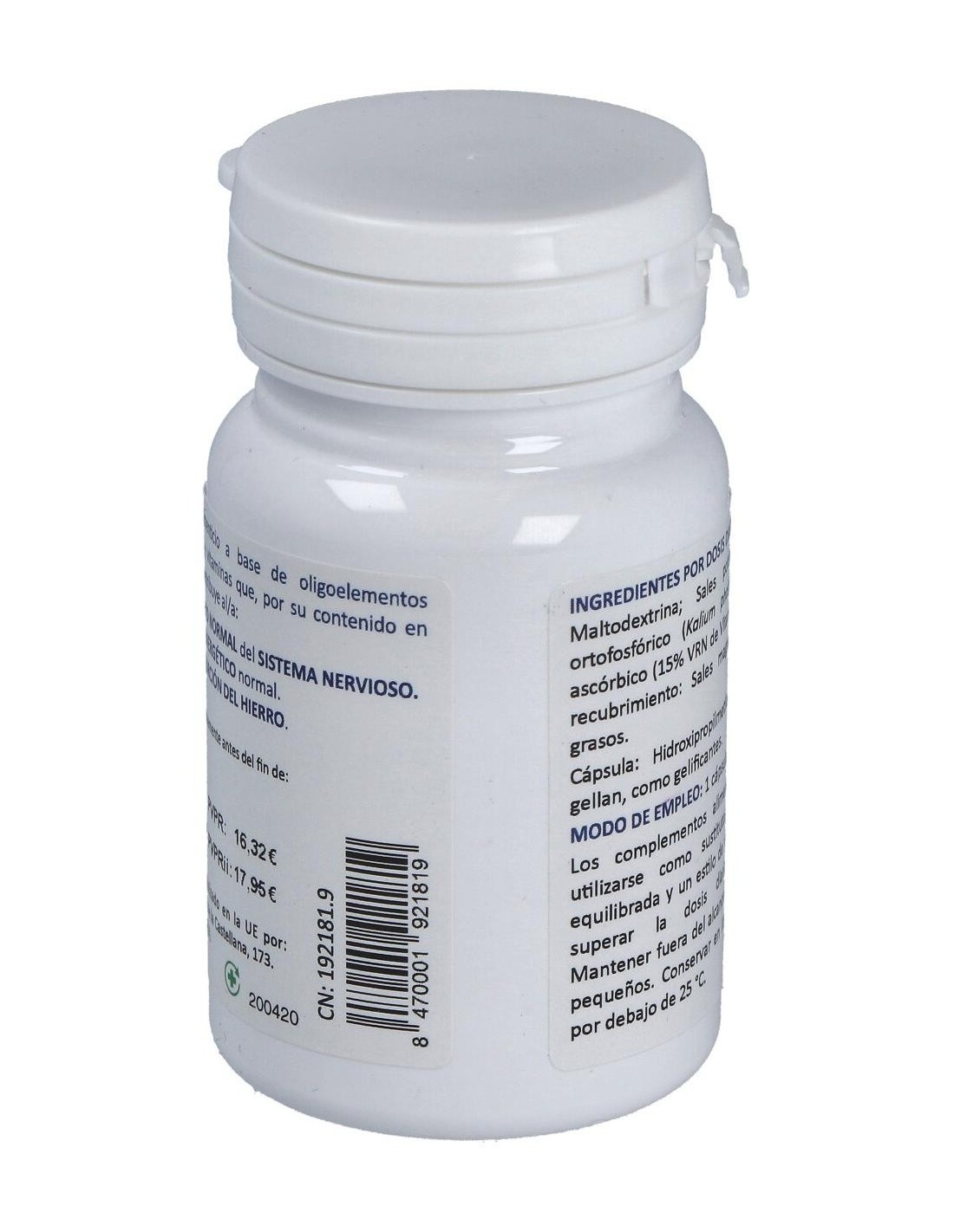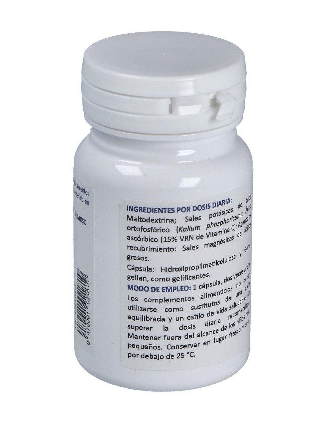 Maltodextrina, Sales potásicas de ácido ortofosfórico, Sales magnésicas de ácidos grasos (E470b), Hidroxipropimetilcelulosa (E464) y Goma gellan (E418).