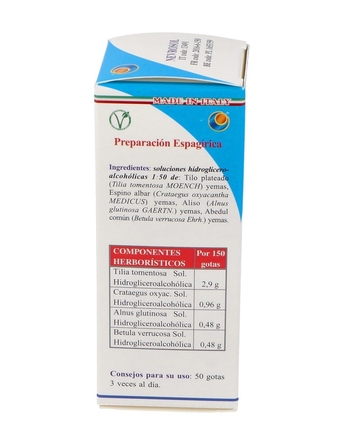 MSA (Macerdo Espagírico-Alquímico de Solanimus R.E. 1/50) de: Tilo plateado (Tilia tomentosa Moench) yemas 2,901 g, Espino albar (Crataegus levigata (Poir) DC.) yemas 0,966 g, Aliso (Alnus glutinosa (L) Gaertn.) yemas 0,483 g, Abedul común (Betula pendula Roth.) yemas 0,483 g.
