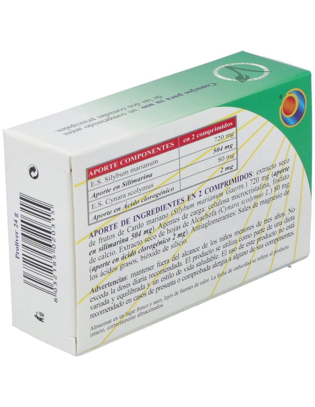 Extracto seco de frutos de Cardo mariano (Silybum marianum) 1,440 g (aporte en silimarina 1008 mg), celulosa microcristalina, extracto seco de hojas de Alcachofa (Cynara scolyimus) 160 mg (aporte en acido clorogenico 4 mg), fosfato de calcio. Antiaglomerante: estearato de magnesio vegetal, bioxido de silicio.