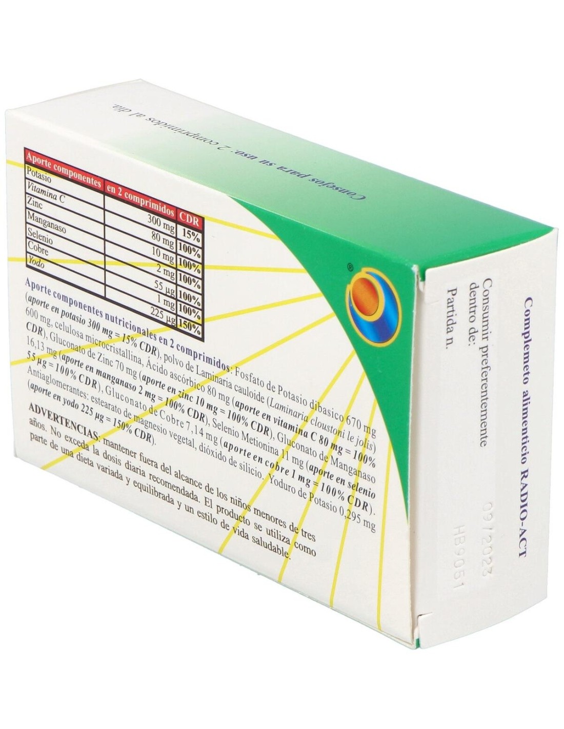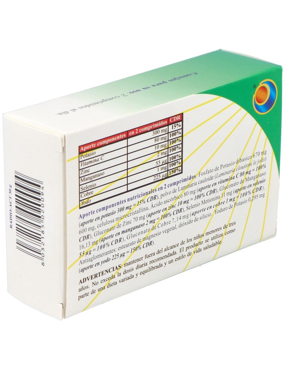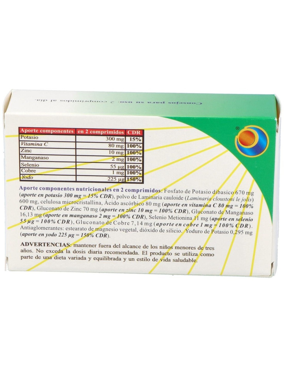 Fosfato de Potasio dibasico 670 mg (aporte en potasio 300 mg ), polvo de Laminaria cauloide (Laminaria cloustoni le jolis) 600 mg, celulosa microcristallina, Ácido ascórbico 80 mg (aporte en vitamina C 80 m), Gluconato de Zinc 70 mg (aporte en zinc 10 mg), Gluconato de Manganaso 16,13 mg (aporte en manganeso 2 mg), Selenio Metionina 11 mg (aporte en selenio 55 mcg), Gluconato de Cobre 7,14 mg (aporte en cobre 1 mg). Antiaglomerantes: estearato de magnesio vegetal, dióxido de silicio. Yoduro de Potasio 0,295 mg (aporte en yodo 225 mg)