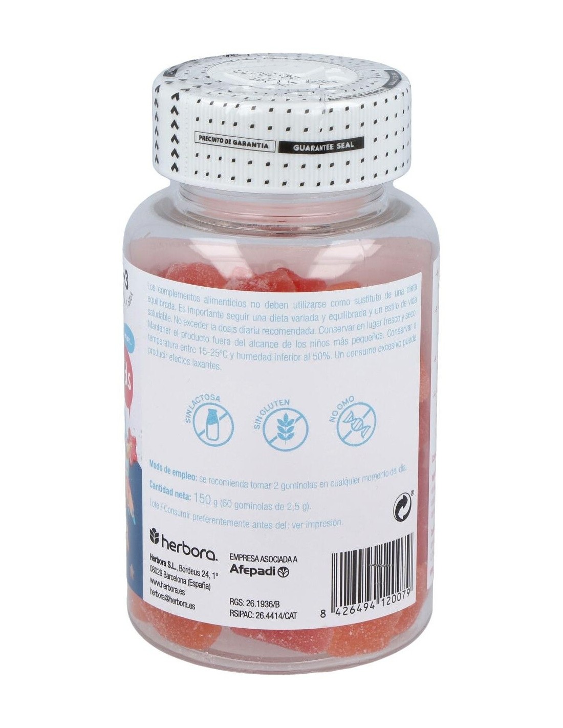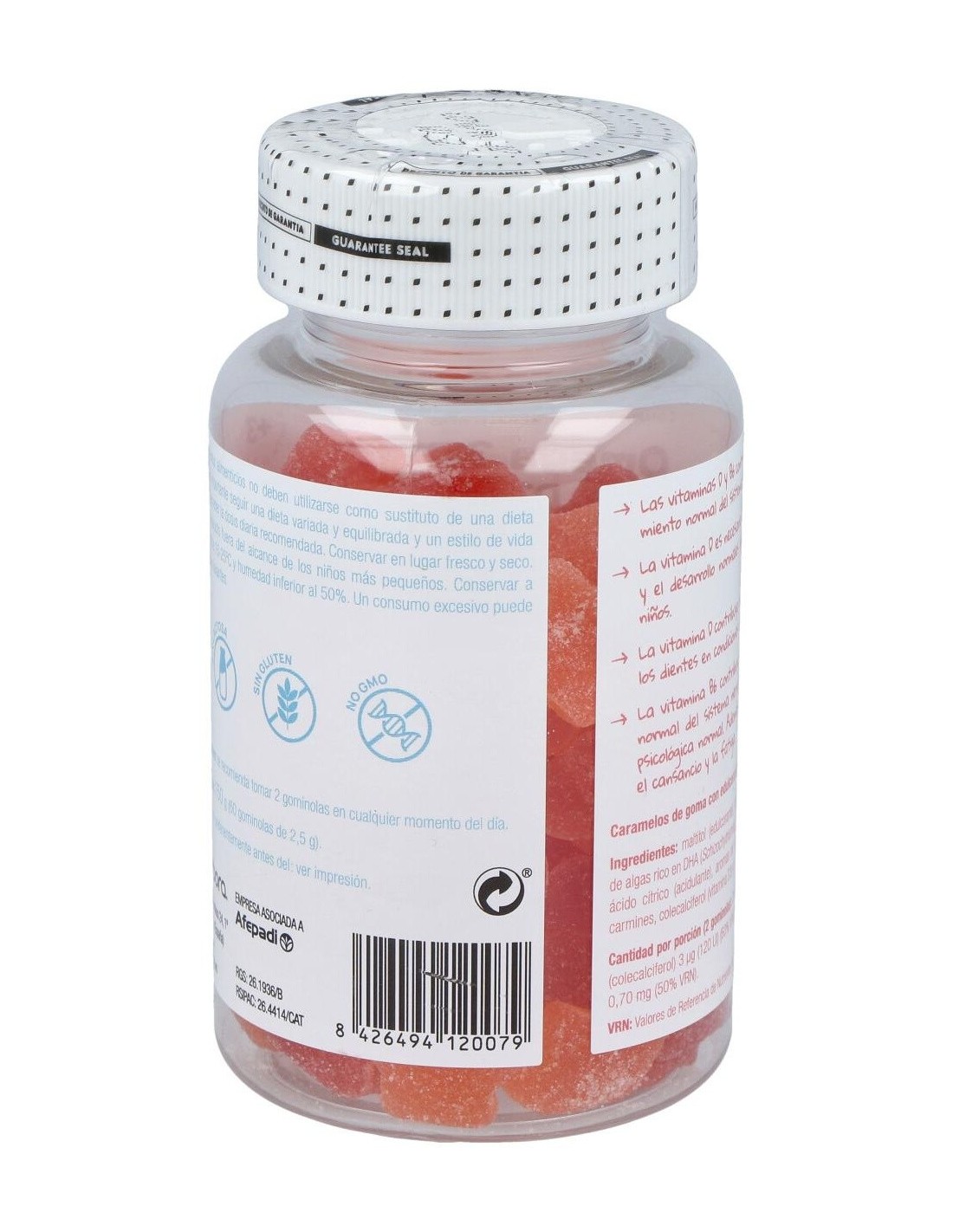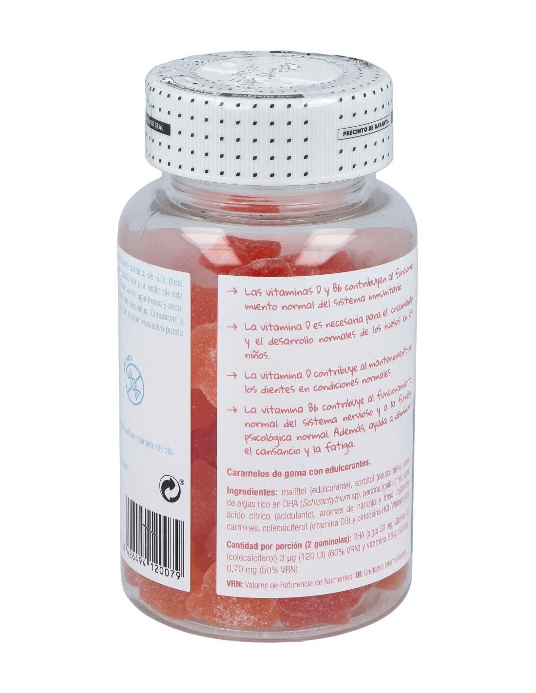 Complemento alimenticio especialmente desarrollado para la edad infantil, en forma de divertidas gominolas con sabores a fresa y naranja, elaborado a base de ácidos grasos omega 3 procedente de aceite de algas, muy rico en DHA.