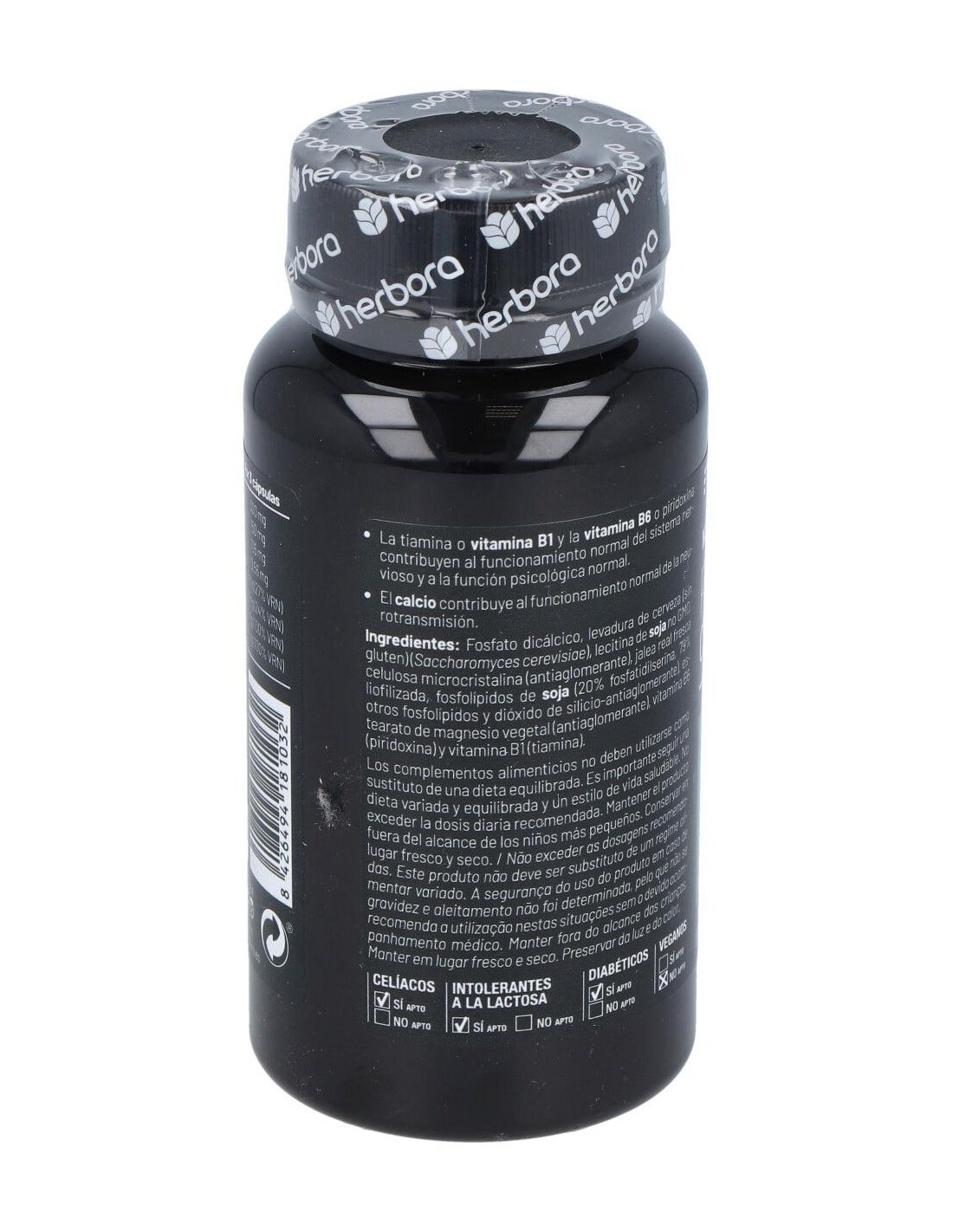 Complemento alimenticio rico en fósforo, calcio, levadura de cerveza (sin gluten) y vitaminas B1 y B6 al 100% de la VRN. También contiene fosfatidilserina. La tiamina o vitamina B1 y la vitamina B6 o piridoxina contribuyen al funcionamiento normal del sistema nervioso y a la función psicológica normal- El calcio contribuye al funcionamiento normal de la neurotransmisión. Apto para celíacos, diabéticos y para intolerantes a la lactosa. No apto para veganos. Este producto no tiene contraindicaciones. No obstante en personas sensibles o alérgicas a algún componente estaría contraindicado. Por esto es recomendable leer bien todos los ingredientes de la composición. Personas que se estén medicando o mujeres que estén embarazadas o en periodo de lactancia, deben consultar a su médico o especialista la toma de Complementos Alimenticios.