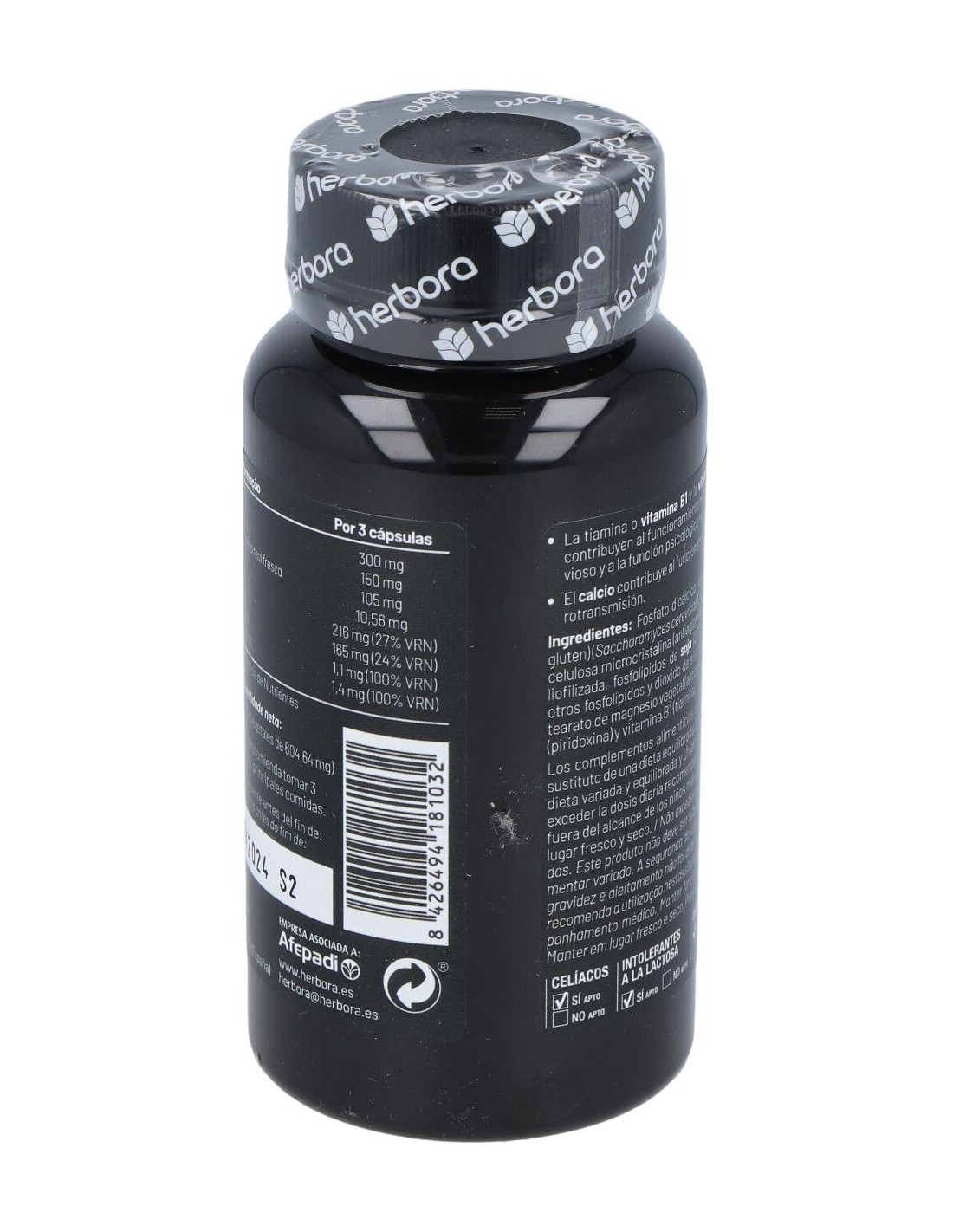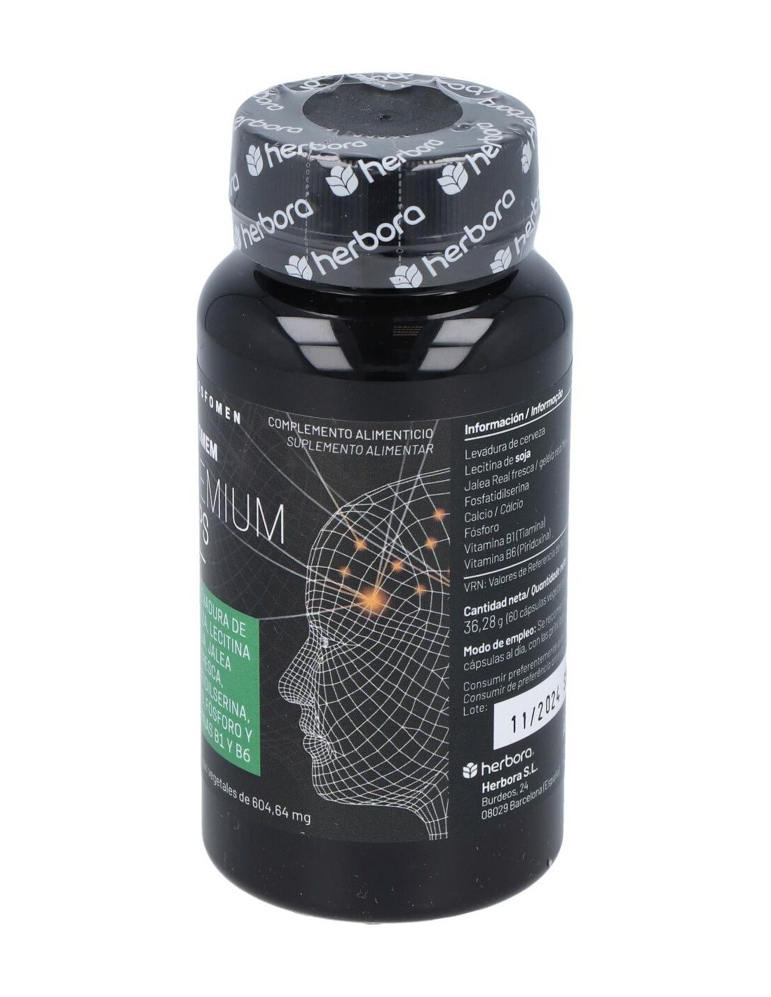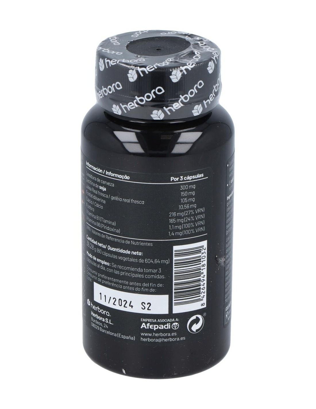 Por 3 cápsulas: Levadura de cerveza (sin gluten) 300 mg, lecitina de soja 150 mg, jalea real fresca 105 mg, fosfatidilserina 10,56 mg, calcio 216 mg (27% VRN), fósforo 165 mg (24% VRN), vitamina B1 (Tiamina) 1,1 mg (100% VRN), vitamina B6 (Piridoxina) 1,4 mg (100% VRN). VRN: Valor de Referencia de Nutrientes. Otros ingredientes: fosfato dicálcico, celulosa microcristalina (antiaglomerante) y estearato de magnesio vegetal (antiaglomerante).