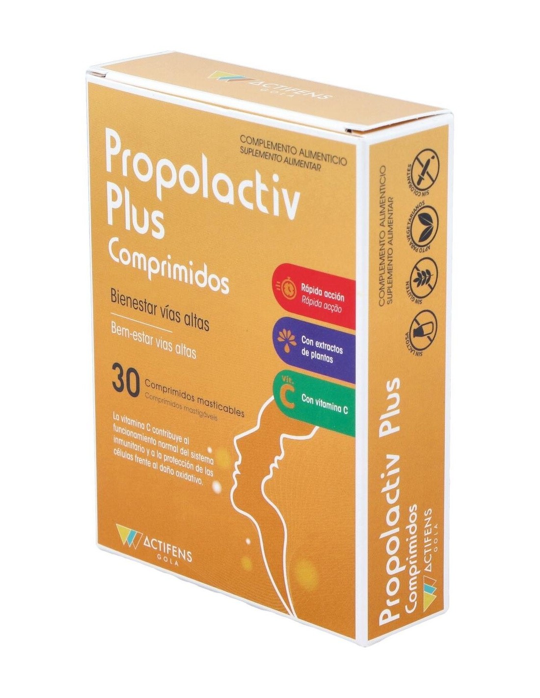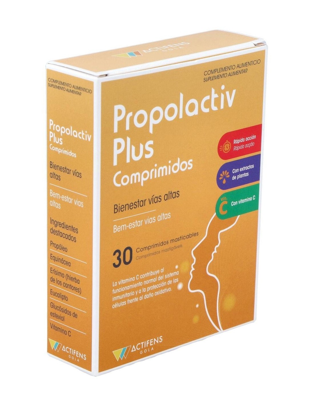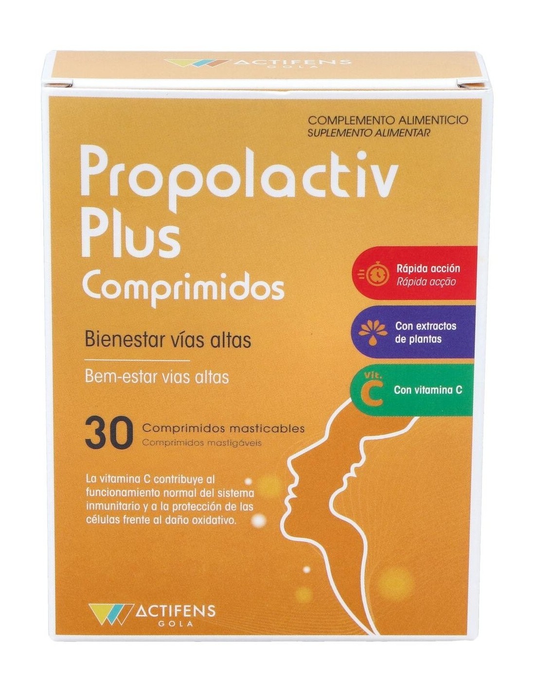 Producto en comprimidos masticables para disolver en la boca con propóleo, equinácea, erysimo, eucaliptus, vitamina C y stevia, nutrientes que contribuyen en el mantenimiento de la garganta en condiciones normales. La vitamina C contribuye al mantenimiento del sistema inmune en condiciones normales y a la protección de las células frente al daño oxidativo.
