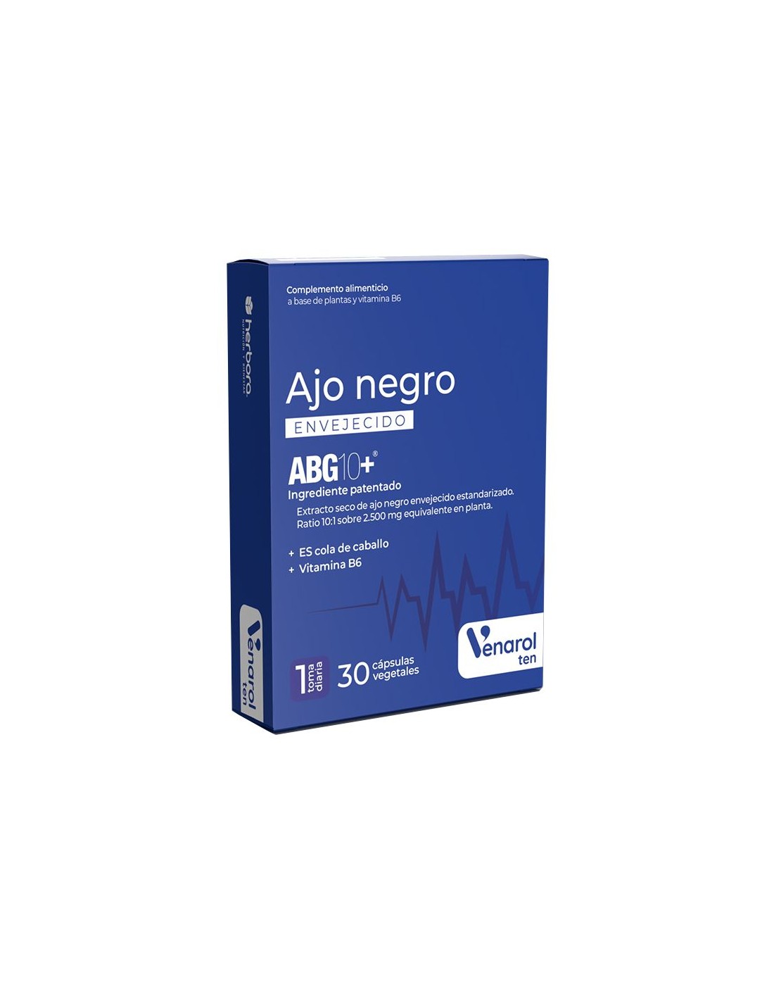 Black Garlic é um suplemento alimentar da gama Venarol que ajuda a reduzir a pressão arterial e os riscos que ela acarreta. Elaborado com ingredientes naturais como ABG10+® (alho preto), cavalinha e vitamina B6 que ajudam a normalizar a pressão sanguínea. A hipertensão arterial ou também conhecida como hipertensão é uma doença comum que danifica as artérias do corpo, aumentando o risco de ataque cardíaco e derrame. Geralmente afeta pessoas idosas, com sobrepeso ou obesidade, por causas genéticas, falta de atividade física ou dieta com muito sal. Em muitas ocasiões, não causa sintomas e a única maneira de detectá-la é medindo a pressão arterial ou realizando exames médicos regulares. No entanto, se a pressão arterial estiver muito alta, pode causar dor de cabeça ou dor no peito, visão turva e outros sintomas. A vitamina B6 ou piridoxina contribui para a síntese normal de cisteína e para o metabolismo normal da homocisteína. Também ajuda a reduzir o cansaço e a fadiga. Princípios ativos: Cavalinha: Grande capacidade de drenagem, torna-se um grande aliado para baixar a pressão arterial ajudando o corpo a eliminar líquidos através da urina. ABG10+® Black Garlic: É um alho preto envelhecido registrado com estudos clínicos. Bulbos de alho frescos inteiros cuidadosamente selecionados são amadurecidos usando a técnica de envelhecimento ABG Cool-Tech®, por várias semanas. Vitamina B6: Contribui para a síntese normal da cisteína e para o metabolismo normal da homocisteína. Composição ativa por cápsula: 300 mg de extrato seco de cavalinha (7% de sílica). 250 mg de ABG10+® (extrato seco de alho negro (Allium sativum) 0,1% em S-alil-cisteína). 2,80 mg de vitamina B6 (piridoxina). Outros Ingredientes: Agente de volume (celulose microcristalina) e agente antiaglomerante (fosfato de cálcio). Conselhos de utilização: Tomar 1 cápsula por dia, de manhã, com o estômago vazio. Apresentação: Embalagem com 30 cápsulas vegetais. Recomendações e advertências: Adequado para vegans. Não contém lactose nem glúten.