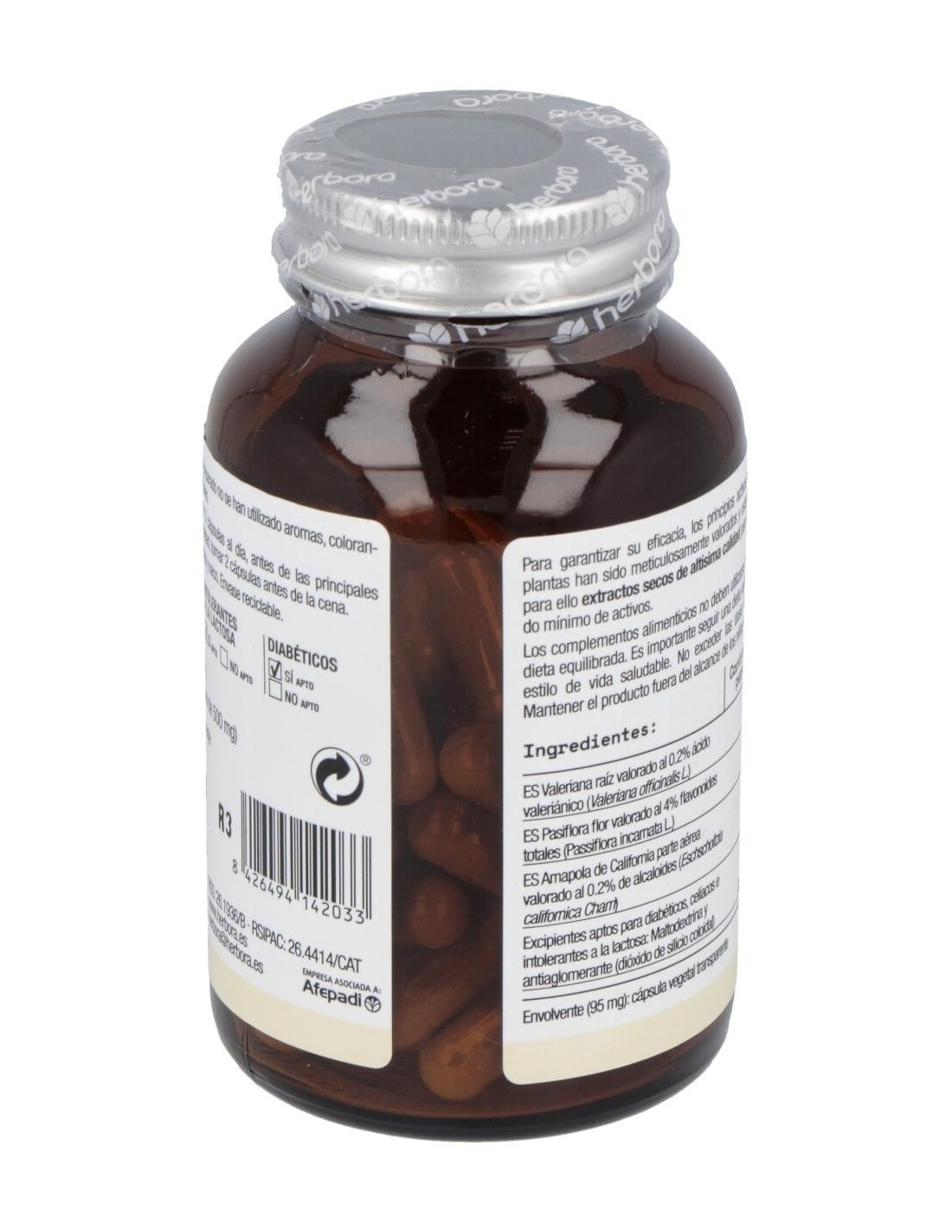 HERBORAComplemento alimenticio en forma de cápsulas, que está indicado para ayudar a conciliar el sueño y ayudar a la relajación en situaciones de nerviosismo o estrés. Contiene una fórmula a base de tres extractos de plantas, amapola de California, valeriana y pasiflora.