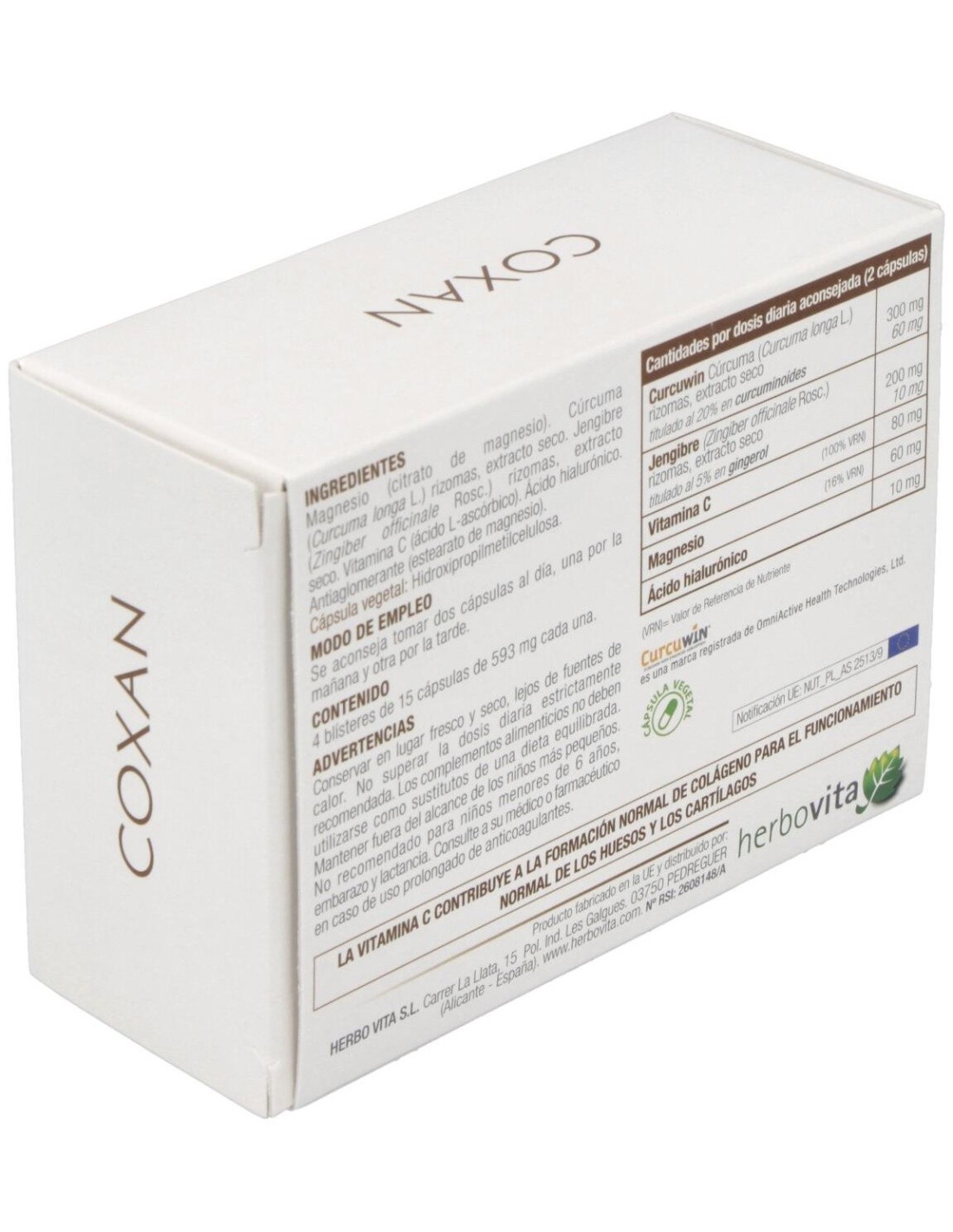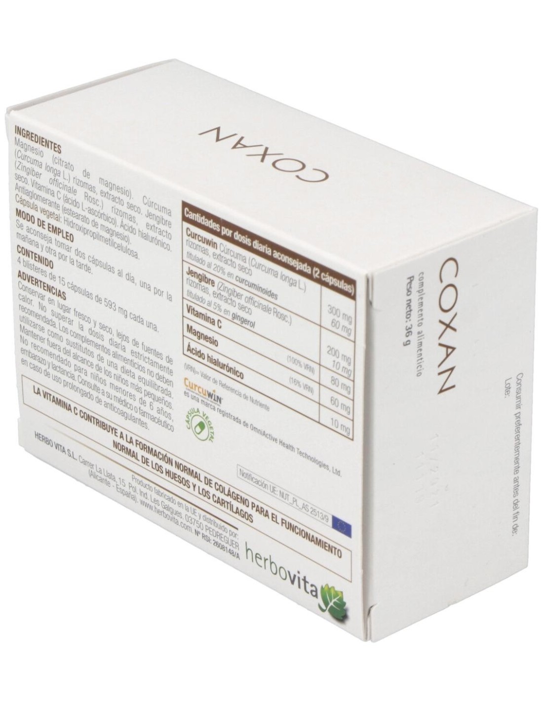Complemento alimenticio en formato cápsulas a base de cúrcuma y jengibre, que está indicado para el mantemiento de un buen estado del aparato osteoarticular. Elaborado con Curcuwin, un extracto patentado con una capacidad de absorción 46 veces mayor a un extracto de curcumina estándar y que contribuye a aliviar la inflamación y la hinchazón asociada a procesos degenerativos articulares o lesiones musculares.