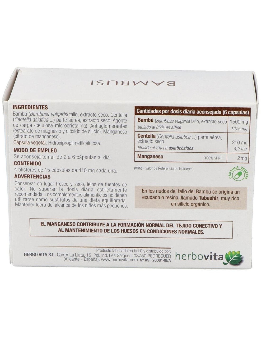 HERBOVITAComplemento alimenticio a base de Bambú, Centella asiática y Manganeso que aumenta la densidad ósea, ayuda a mantener la flexibilidad y la movilidad articular, mejora el rendimiento físico en el deporte y estimula la regeneración y el mantenimiento de la piel, el cabello y las uñas. Complemento alimenticio a base de Bambú, Centella asiática y Manganeso que aumenta la densidad ósea, ayuda a mantener la flexibilidad y la movilidad articular, mejora el rendimiento físico en el deporte y estimula.
