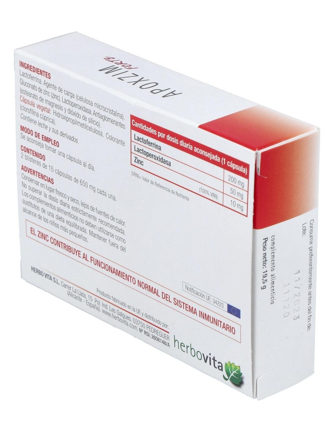 Complemento alimenticio en formato cápsulas, elaborado con una combinación a base de lactoferrina, lactoperoxidasa y zinc, que actúa com un potente antibiótico natural. Contribuye al funcionamiento normal del sistema inmunitario, o a reforzarlo en procesos de infección por virus, hongos o bacterias.