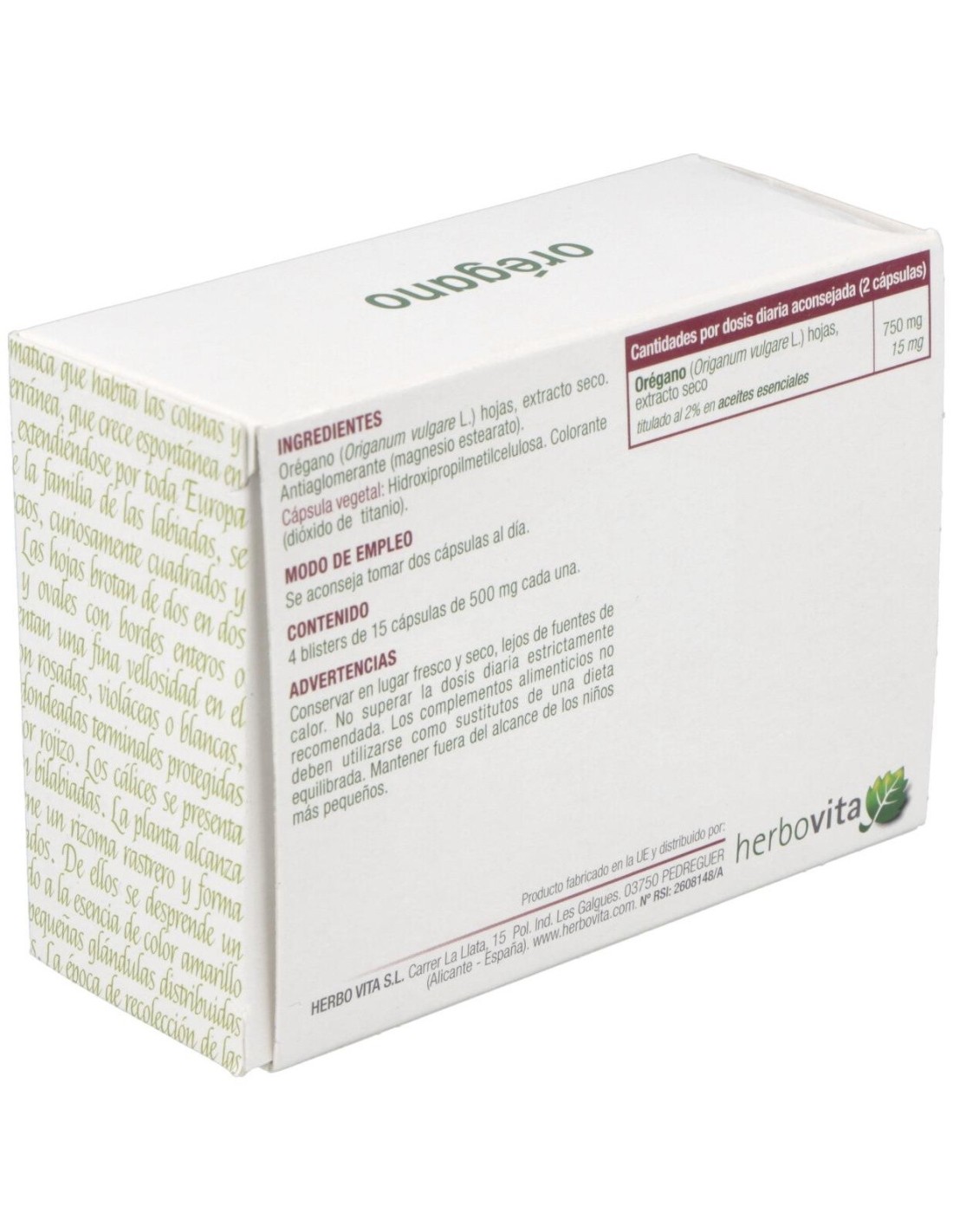 HERBOVITAComplemento alimenticio elaborado a base de hojas de orégano 100% orgánicas. Posee propiedades antibacterianas, antiparasitarias y antifúngicas.