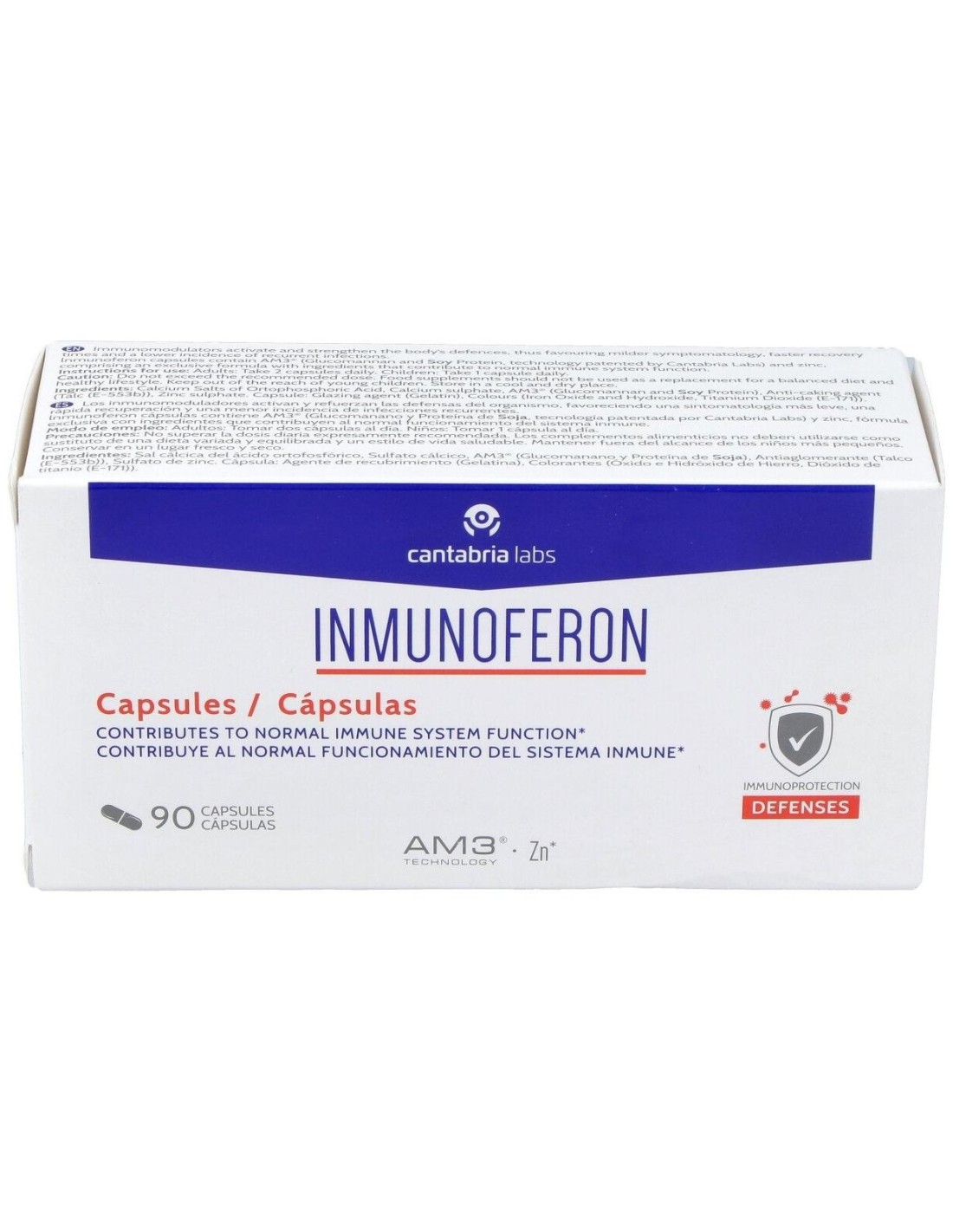 Inmunoferon 90cáps es un complemento alimenticio indicado para reforzar las defensas naturales del organismo. Gracias al complejo AM3, formado por glucomanano y proteína de soja, así como a su aporte en zinc, contribuye al normal funcionamiento del sistema inmunitario y favorece la prevención de infecciones, al mismo tiempo que ayuda a acelerar la recuperación.