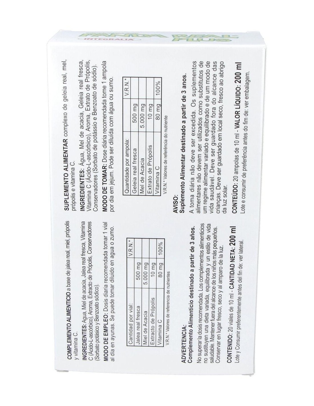 Jalea Real fresca 400 mg, Vitamina C 12 mg ( 15% C.D.R.), Lecitina de soja 10 mg, Extracto de Própolis 5 mg.