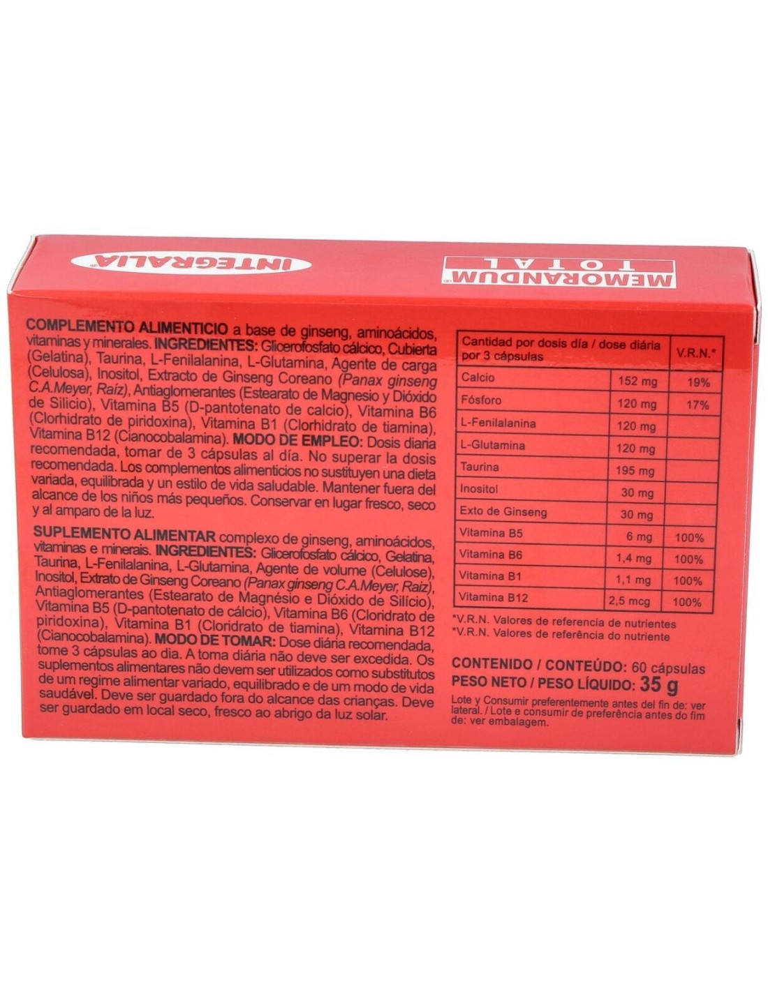 Cápsulas para la mejora del sistema cognitivo. Integralia Memorandum es un producto que contiene 60 cápsulas en el empaque. Promueve la concentración y el correcto funcionamiento de las habilidades intelectuales. Fomenta la memoria a largo y corto plazo. Funciona como una herramienta para la realización de tareas bajo presión. Aumenta la actividad cerebral con relación a las tareas específicas de larga duración. Ayuda a la toma de decisiones de forma rápida. Está recomendado para personas en entornos de trabajo exigentes. Se sugiere su uso a personas con problemas de concentración o desórdenes de déficit de atención. Útil para estudiantes universitarios. No apto para el manejo de niños y no debe ser consumido por infantes. No se recomienda su uso a personas bajo tratamiento psicoterapéutico. En caso de presentar reacciones adversas a las esperadas, consultar con el médico de inmediato.