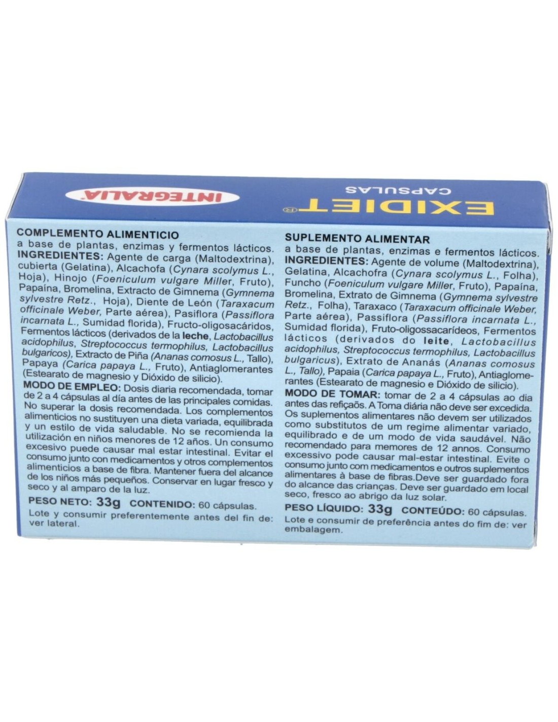 Exidiet Vientre Plano de Integralia es un suplemento dietético idóneo para las personas que quieren bajar de peso y minimizar el volumen del vientre. El producto protege el sistema digestivo de manera natural y completa. Proporciona sensación de saciedad, evitando el exceso de alimentos, de manera que ayuda a minimizar la productividad de acidez y gases.