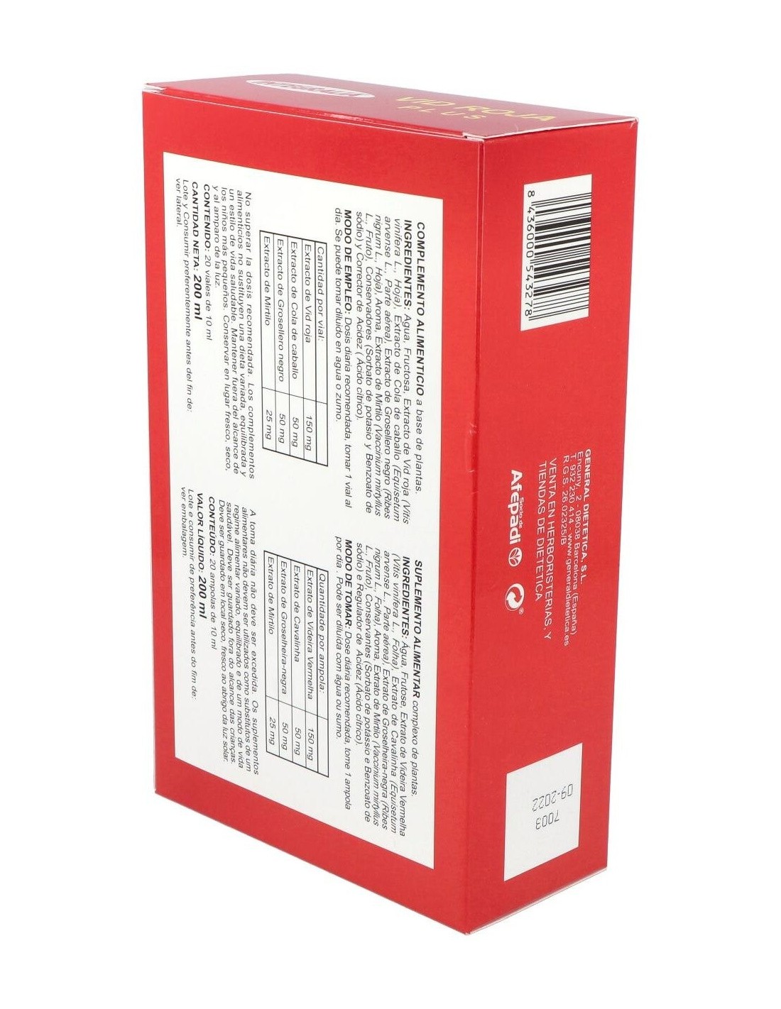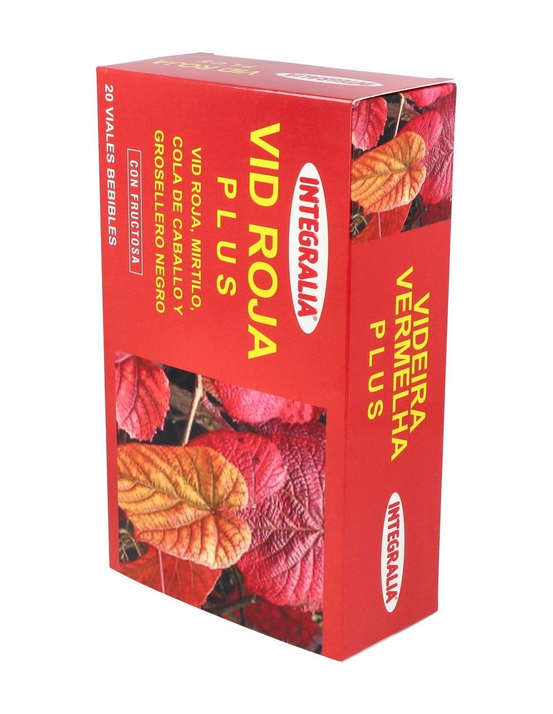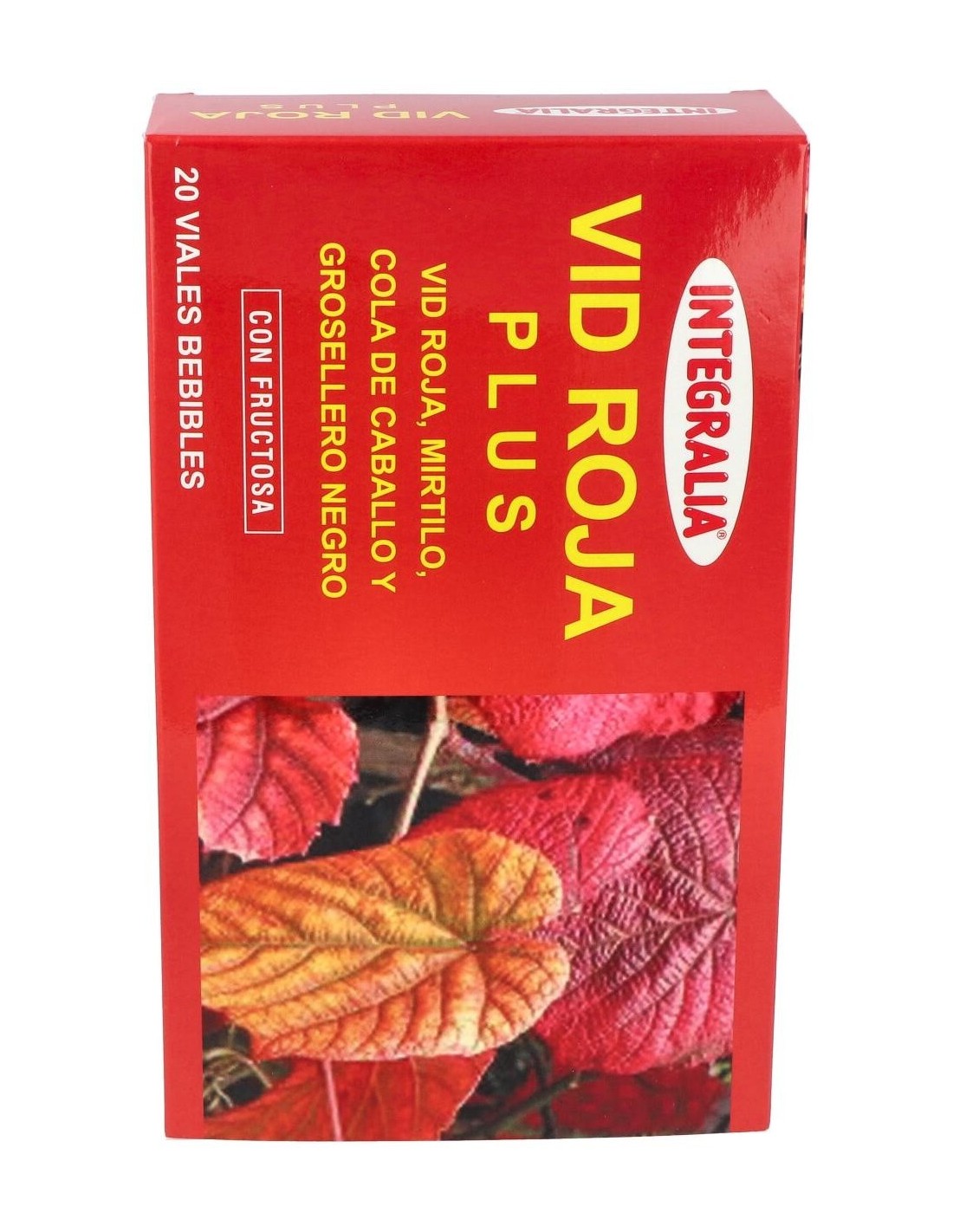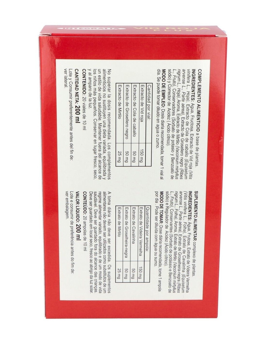 Envase de 20 viales visibles de vid roja elaborado por Integralia. Este producto es utilizado para mejorar la circulación venosa de los pacientes con problemas asociados a las varices u otras enfermedades de carácter cardiovascular. Además de su ingrediente principal, cuenta con diente de león, mirtilo y extracto de grosellero negro. Estos componentes ayudan a prevenir riesgos coronarios que puedan traer complicaciones más serias. No se recomienda usar en menores de doce años ni en embarazadas sin consulta previa de un médico especialista. Con varios años de venta en el mercado, es un artículo confiable para la familia.