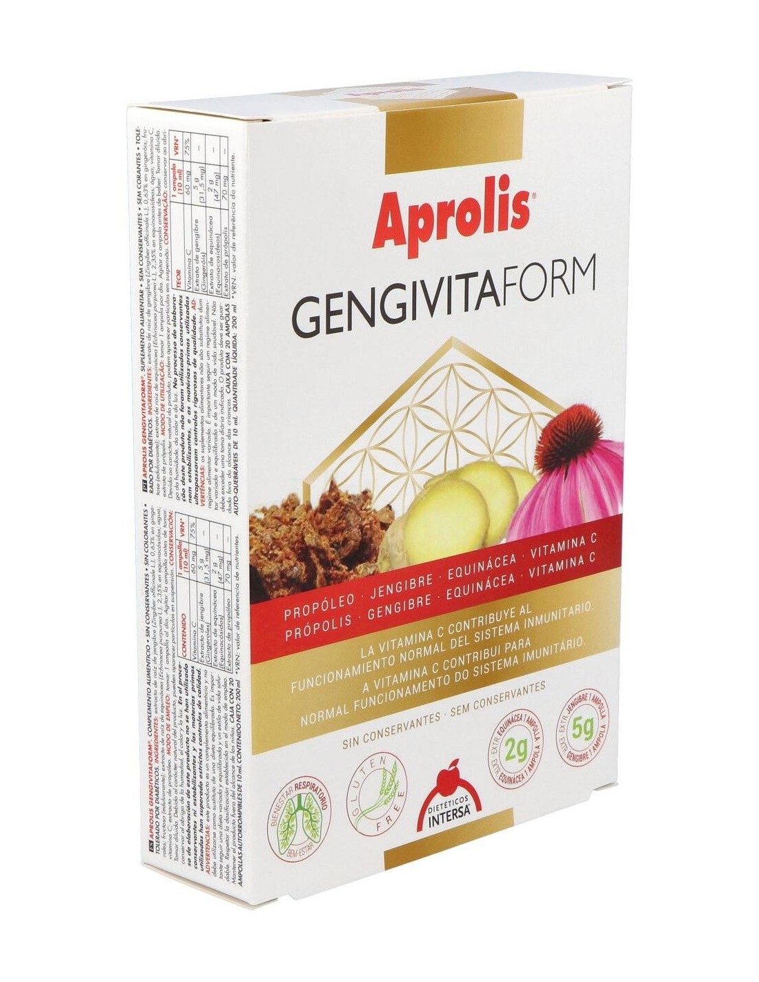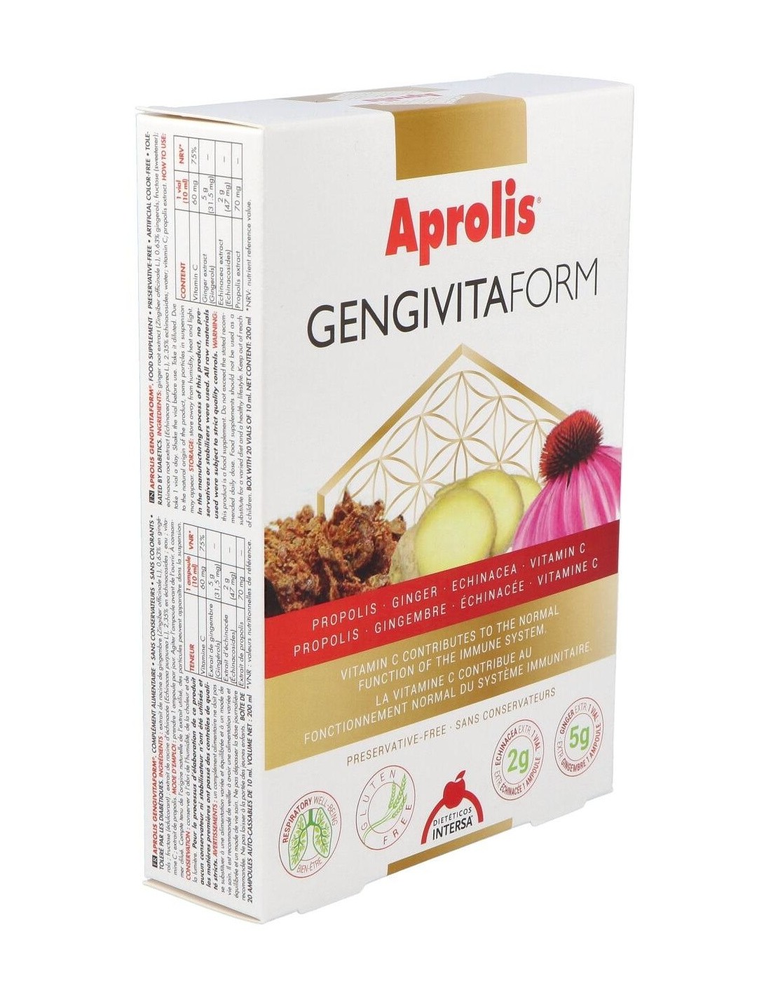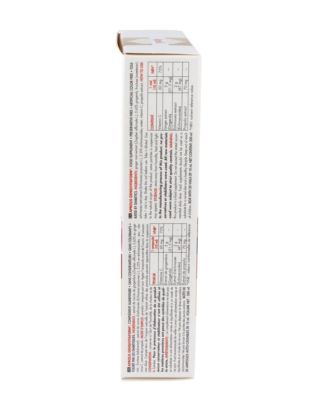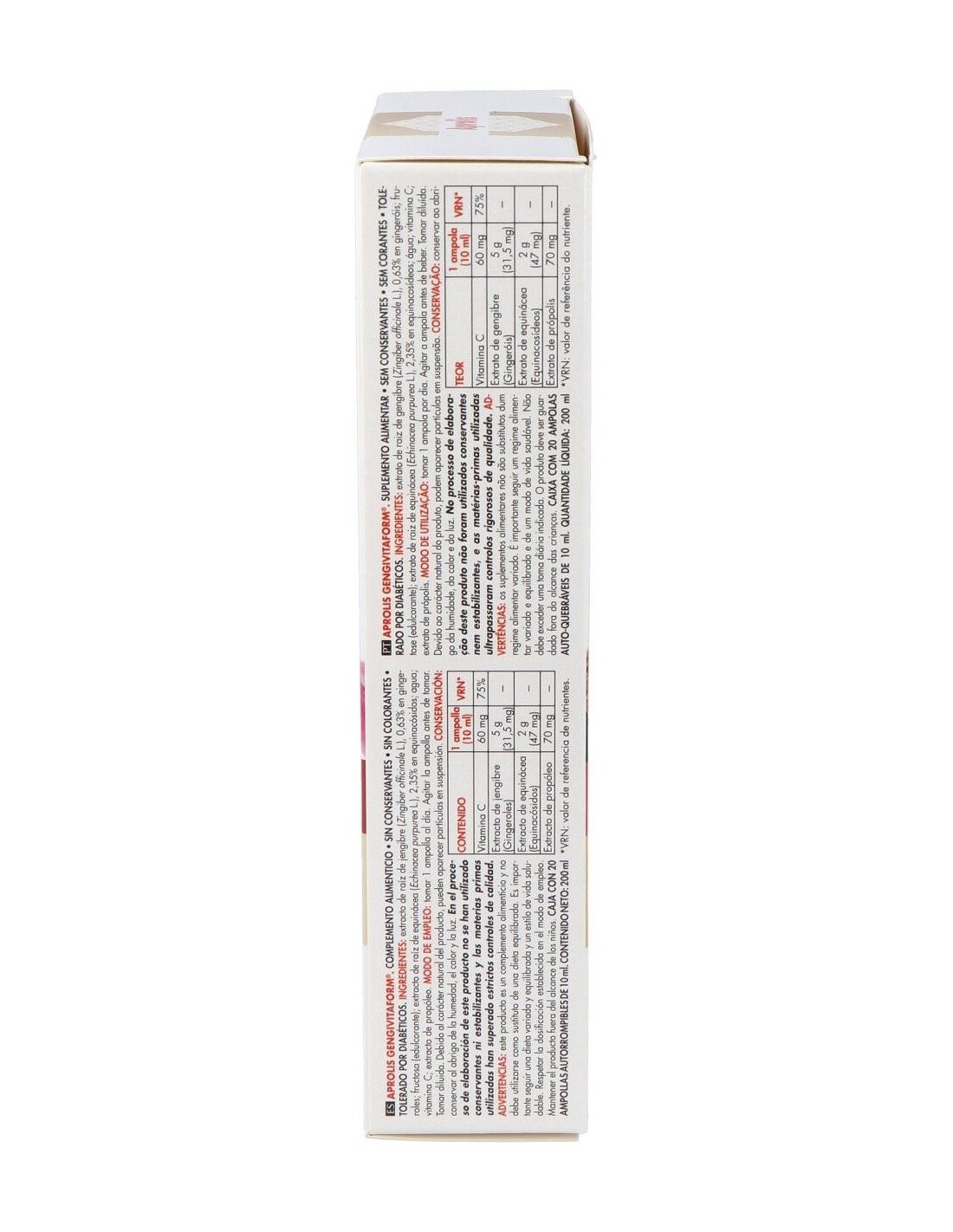 Estas ampollas cuentan con una combinación de propóleo, jengibre, vitamina C y esquinacea. Una ampolla contiene 5 gramos de extracto de rizoma de jengibre y 2 gramos de extracto de equinácea. El rizoma se ha utilizado desde siempre en la medicina china para brindar calor al pulmón en momentos de resfriado. Este producto de Intersa apoya al funcionamiento correcto del sistema inmune debido a que posee vitamina C. También la presentación viene en una caja de 20 ampollas de 10ml.