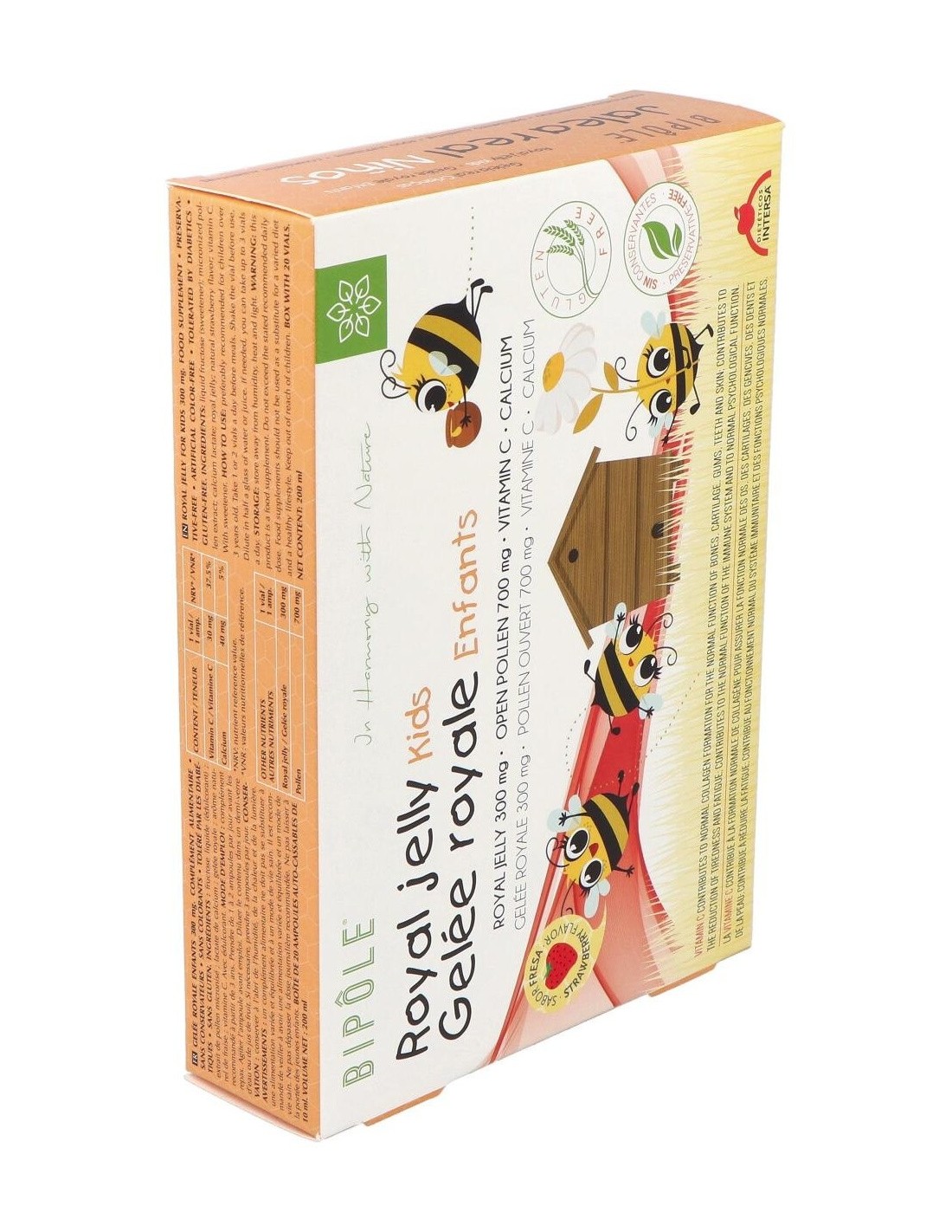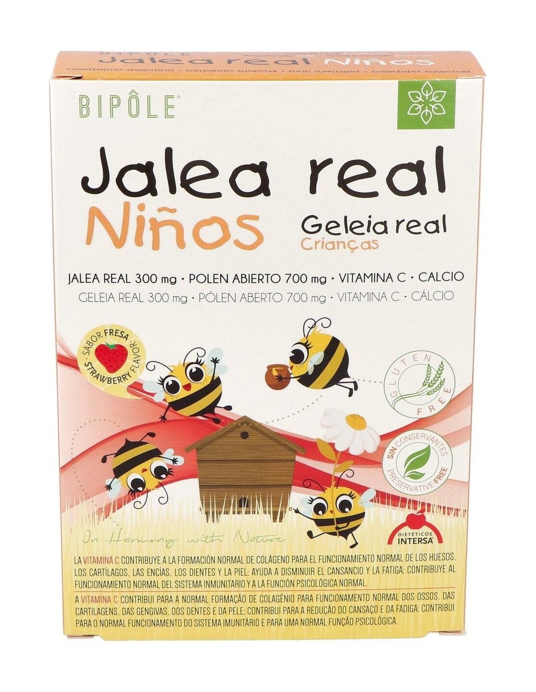 Suplemento infantil con nutrientes como jalea real y polen abierto. La vitamina C contribuye a disminuir el cansancio y la fatiga, al normal funcionamiento del sistema inmune y a la función psicológica normal. Ampollas con sabor a fresa.
