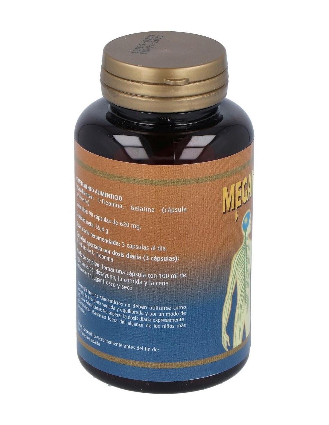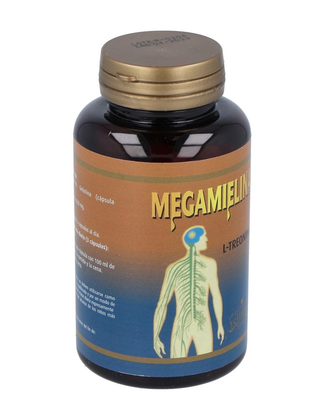 Cápsulas de complemento alimenticio de Megamielina L-Treonina de la marca Jellybell que ayuda a favorecer las funciones de las fibras nerviosas y para un correcto crecimiento muscular del esqueleto, un correcto funcionamiento de las enzimas digestivas y ciertas proteínas inmunes y un funcionamiento correcto del hígado, que están directamente relacionados con ciertos procesos del sistema nervioso central.