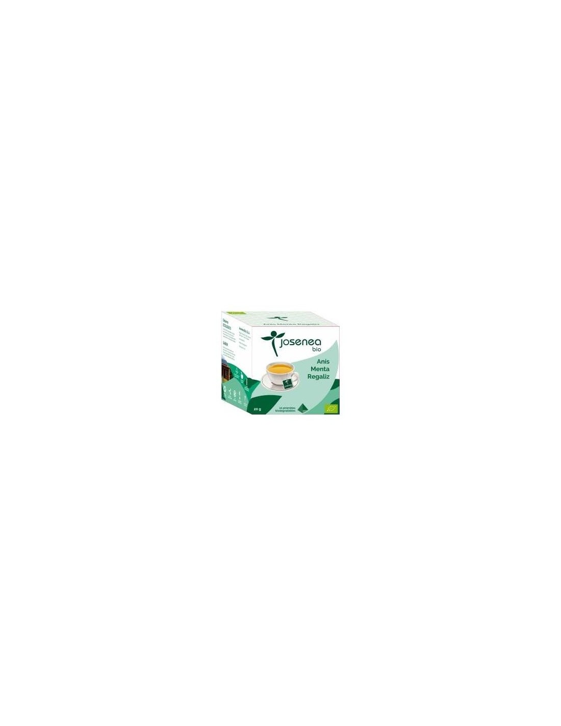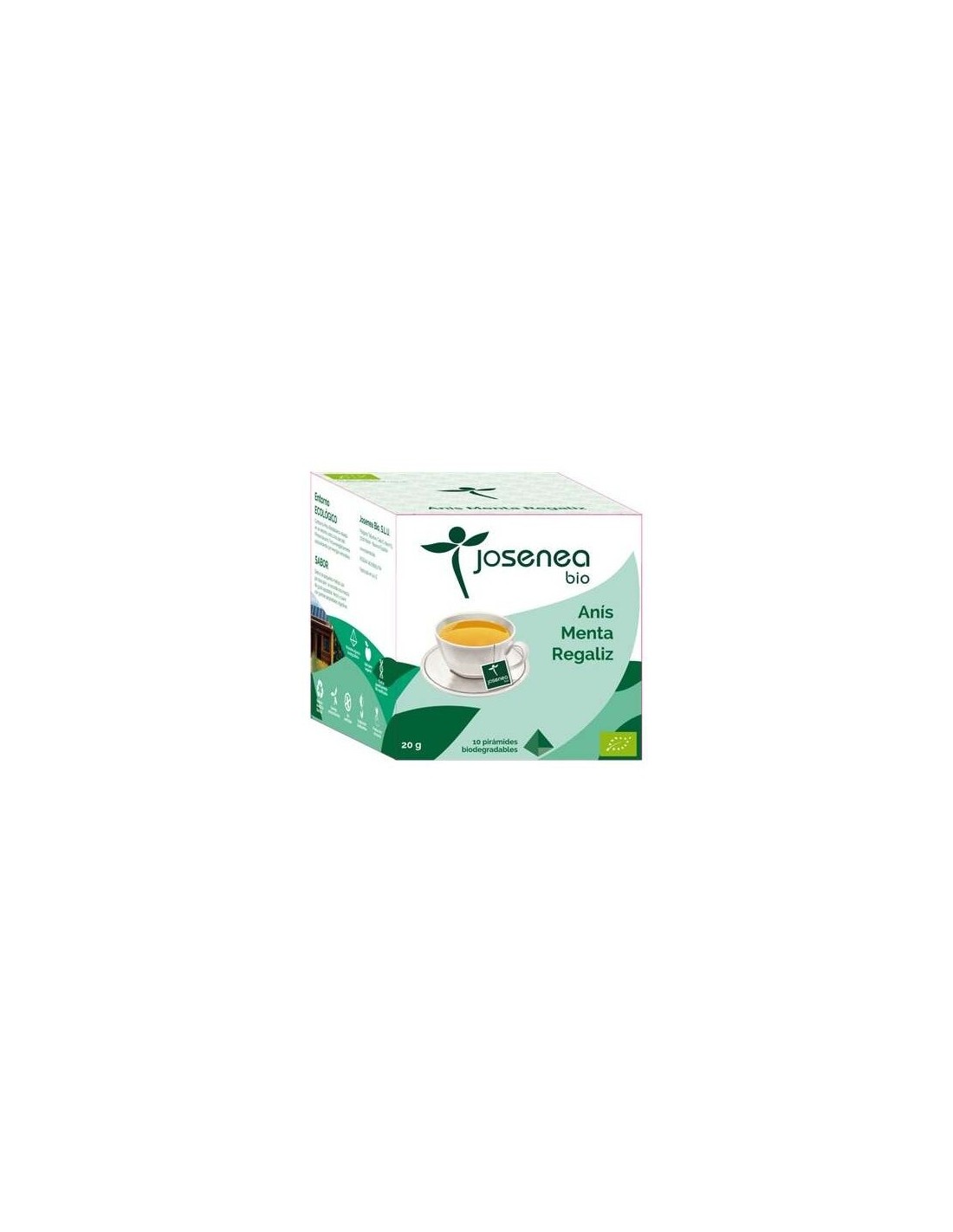 JOSENEAJosenea Anís menta regaliz BIO caja 10 pir infusión a base de anís, menta y regaliz, una combinación que le proporciona a esta infusión un gusto fresco y muy agradable, además colabora en la salud del sistema digestivo. Modo de empleoCalentar el agua durante 5 minutos a 95º, después añadir el producto.