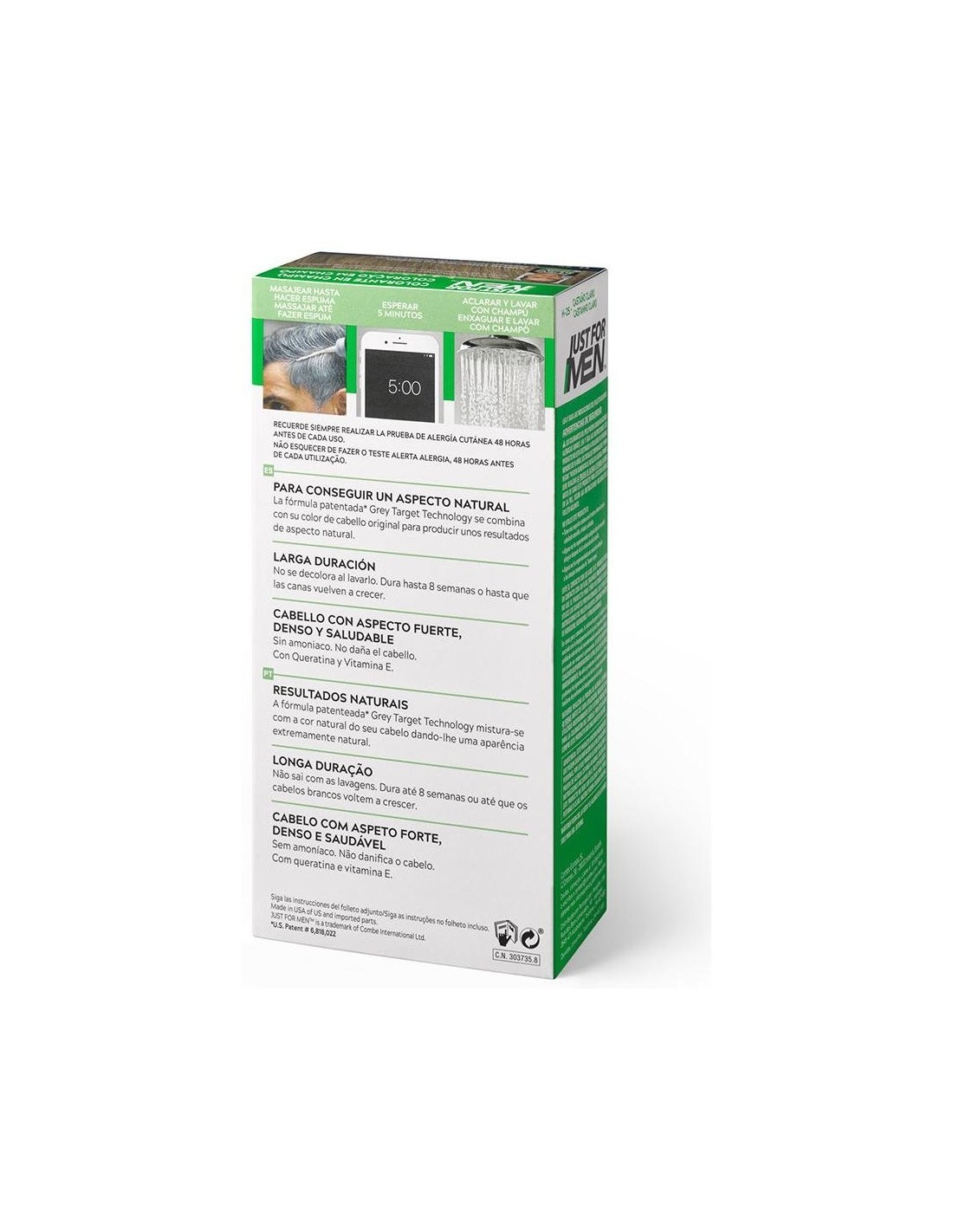 Colorante en champú. Restaura el color original. Aspecto 100% natural. Con queratina y vitamina E para un cabello fuerte. Resultados en 5 minutos. No se decolora al lavarlo, dura hasta 8 semanas o cuando las canas vuelvan a crecer.