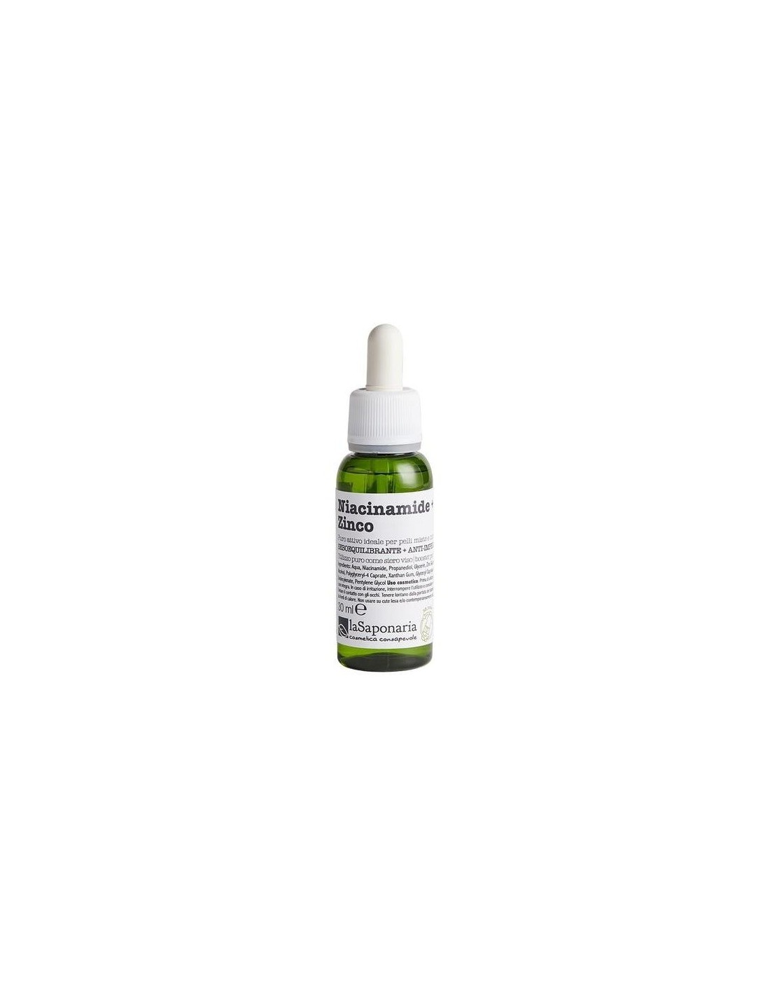 LA SAPONARIASérum facial con acción seborreguladora y antiimperfecciones. La niacinamida es un derivado de la vitamina B3 (o niacina) ideal para las pieles mixtas y con impurezas. Es un auténtico salvavidas para todas las pieles grasas, pero también para las estresadas y contaminadas. Junto con el zinc, que tiene propiedades calmantes y astringentes, es el aliado perfecto en la lucha contra los granos, las manchas y los puntos negros. Este extraordinario activo es capaz de reducir la producción de sebo y la aparición de nuevas impurezas, de calmar y secar las ya existentes y de dar firmeza a la textura de la piel reduciendo los poros dilatados, las rojeces de los granos e incluso las cicatrices del acné gracias a su acción despigmentante. La Niacinamida + Zinc también desempeña un papel importante en la protección y el refuerzo de la barrera cutánea, previniendo el fotoenvejecimiento y manteniendo una buena hidratación de la piel.