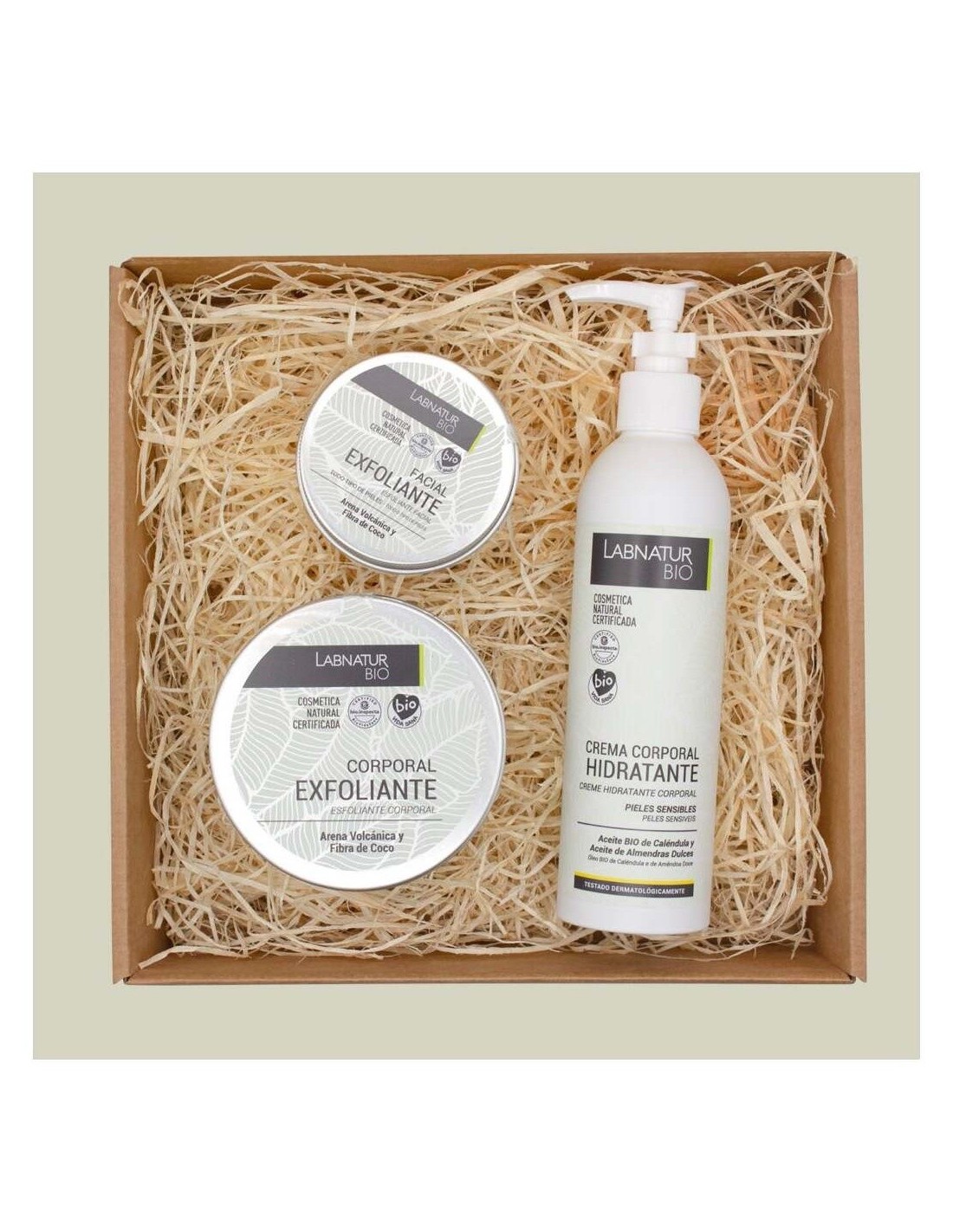 Contiene Crema corporal hidratante 250 ml+ Exfoliante facial 100 ml + Exfoliante corporal arena volcánica y coco 250 ml.