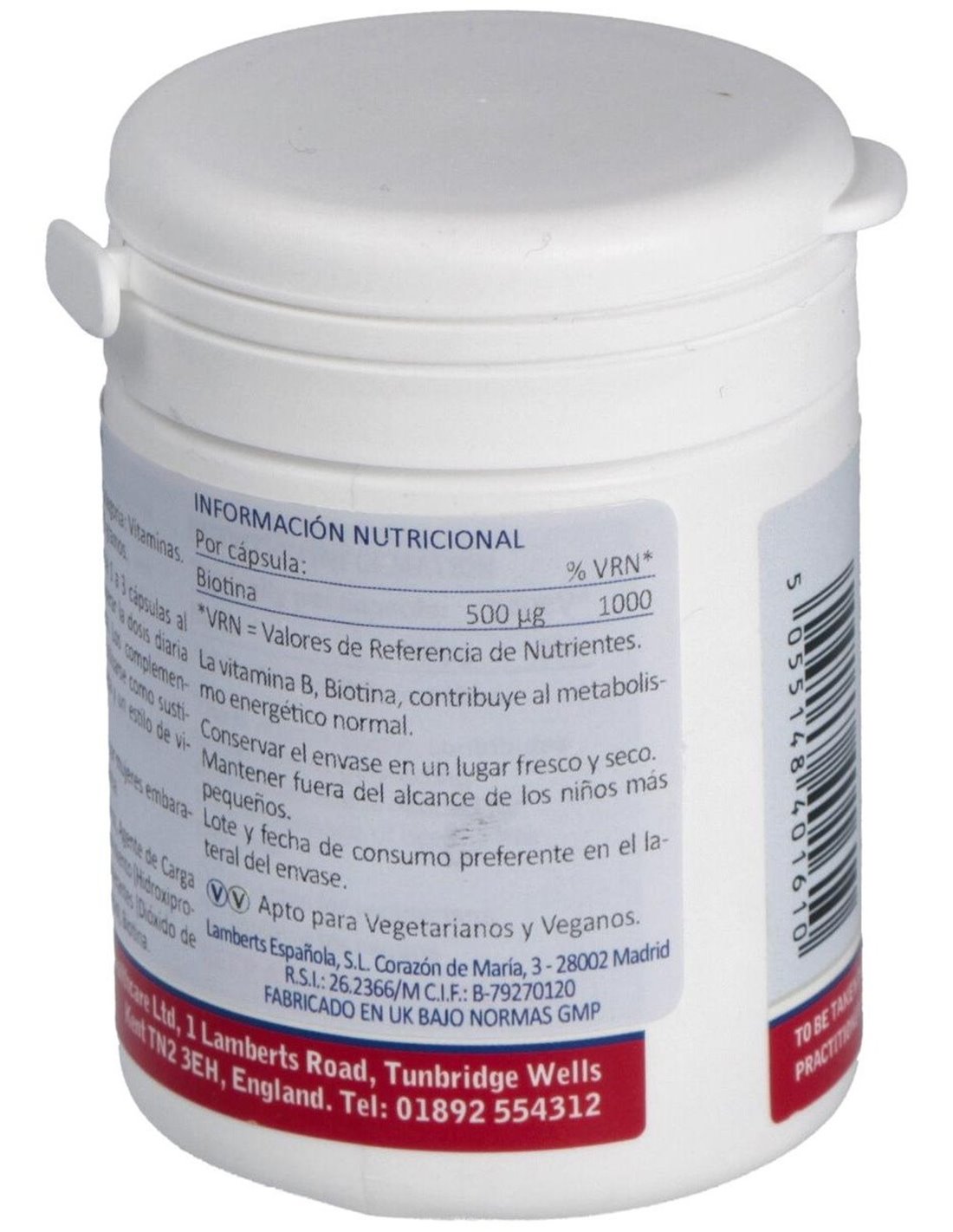 La biotina contribuye al mantenimiento normal de la piel, el cabello y las mucosas. También apoya a la función normal psicológica, al sistema nervioso y el metabolismo de los macronutrientes. Producto apto para veganos y vegetarianos.