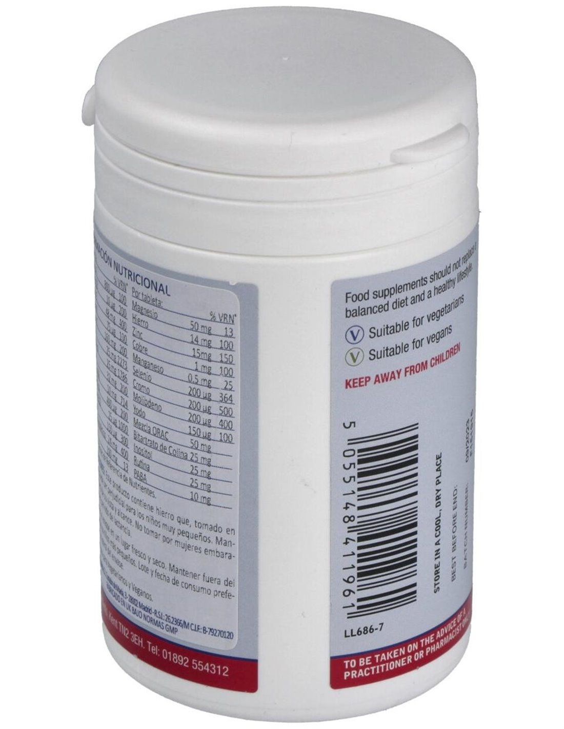 Complemento alimenticio rico en vitaminas y minerales. Aporta gran cantidad de vitaminas y minerales esenciales para el día a día de cualquier persona adulta. Apto para veganos. Todas las vitaminas están presentes en proporciones relevantes, haciéndolo un producto útil cuando se requiere un complejo B de media/alta potencia, junto a los antioxidantes beta caroteno y las vitaminas C y E.
