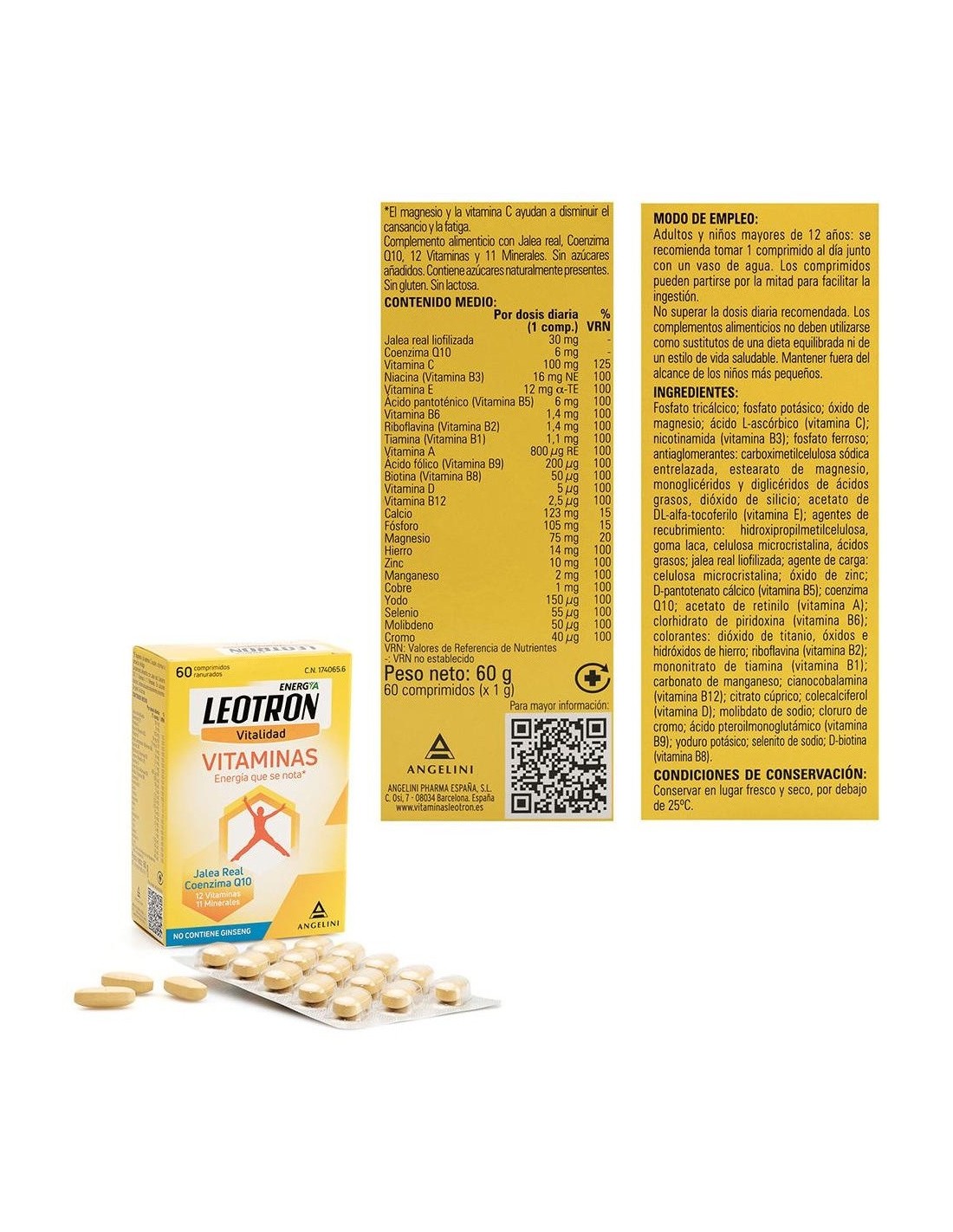 LEOTRONComplemeto a base de jalea real, Q10, 12 vitaminas y 11 minerales. Las vitaminas B2, B5, B6, B12, C, el magnesio y el hierro ayudan a disminuir el cansancio y la fatiga. El magnesio, yodo, calcio, hierro, fósforo y cobre ayudan al metabolismo energético normal. Para adultos y niños a partir de 12 años.