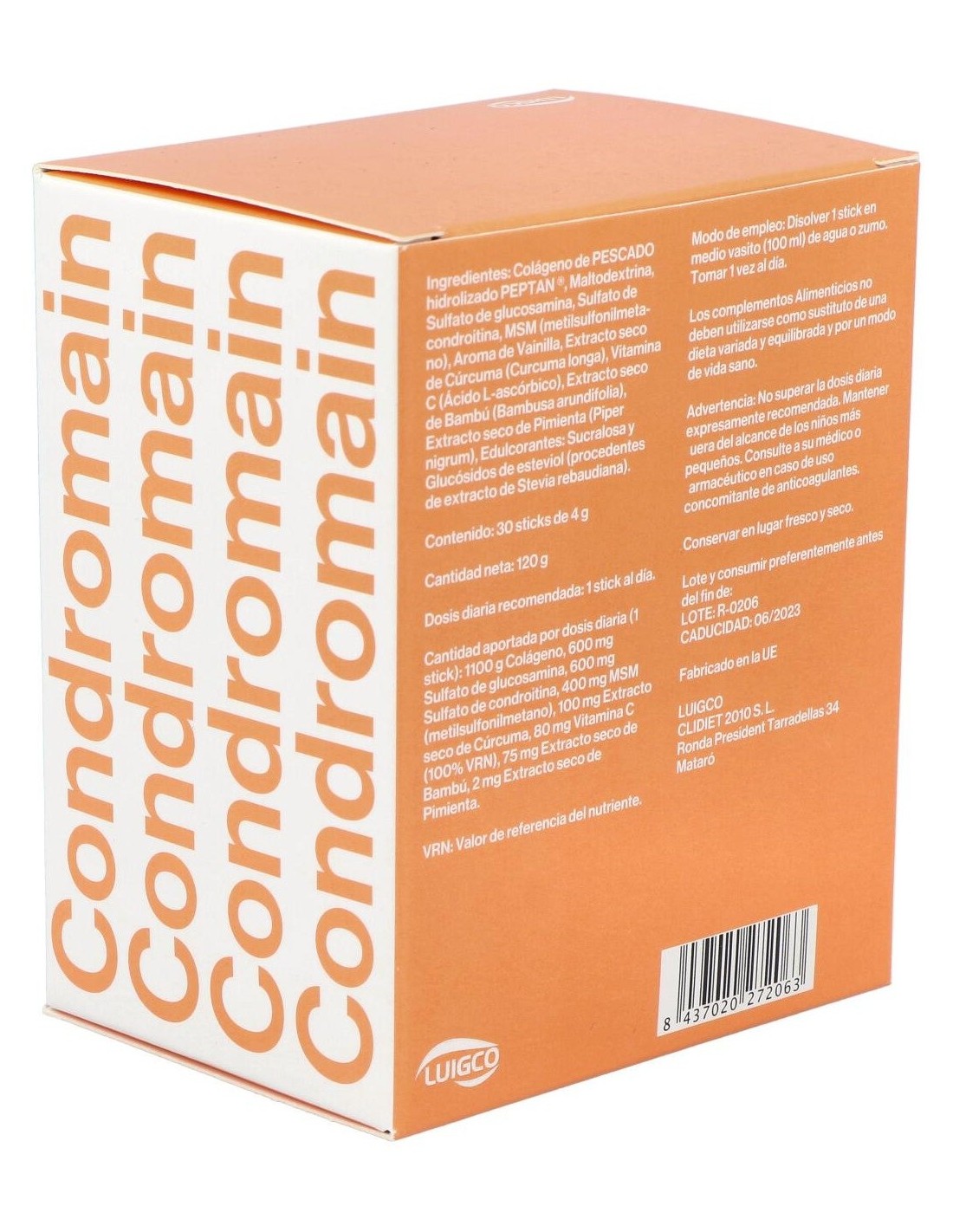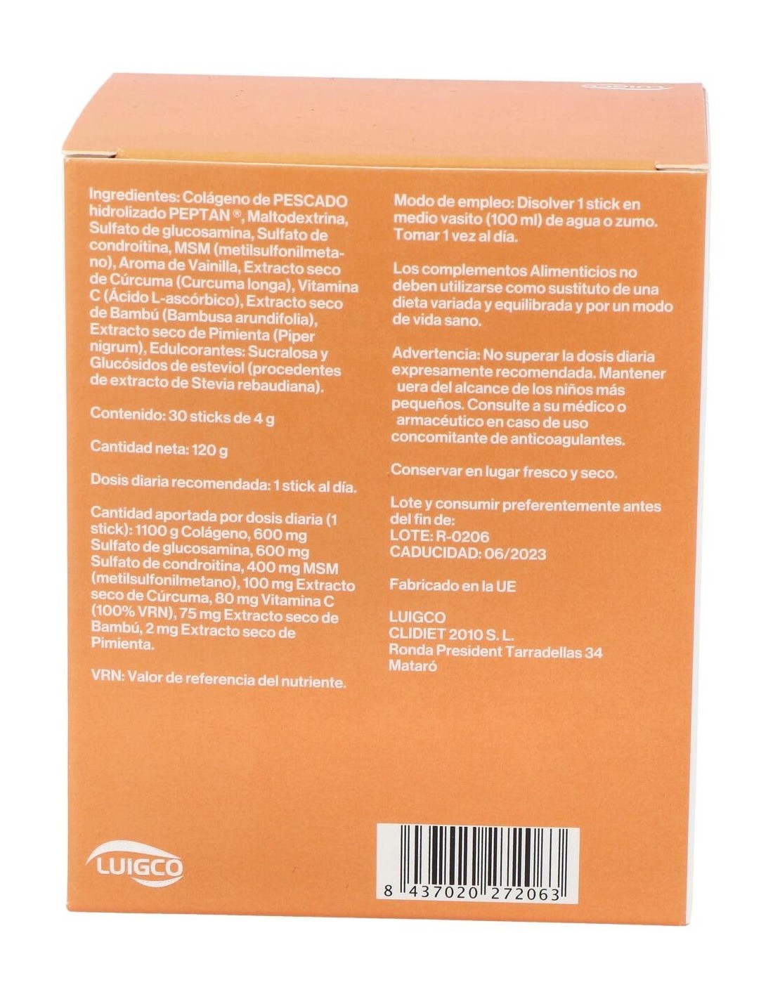 Complemento alimenticio elaborado a base de extractos naturales para contribuir a la salud articular. Contiene colágeno marino hidrolizado, que favorece la flexibilidad y movilidad articular. Con sulfato de glucosamina y condroitina, que ayudan a regenerar los cartílagos y a proteger los huesos. Enriquecido con extracto de pimienta, con propiedades antiinflamatorias y estimulantes de la circulación sanguínea. Coadyuvante en tratamientos de artrosis. Se presenta en práctico formato de viales orales.