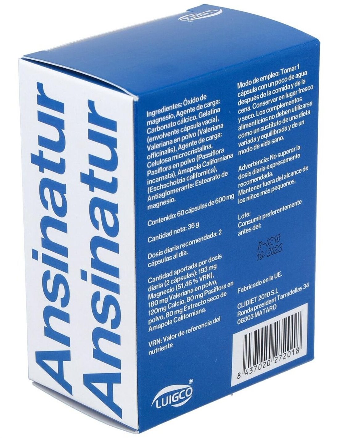 Celulosa microcristalina (agente de carga), óxido de Magnesio (160 mg), Carbonato cálcico (120 mg),Valeriana officinalis (90 mg), Passiflora incarnata (40 mg), Amapola de California (40 mg), estearato magnésico (antiagregante).