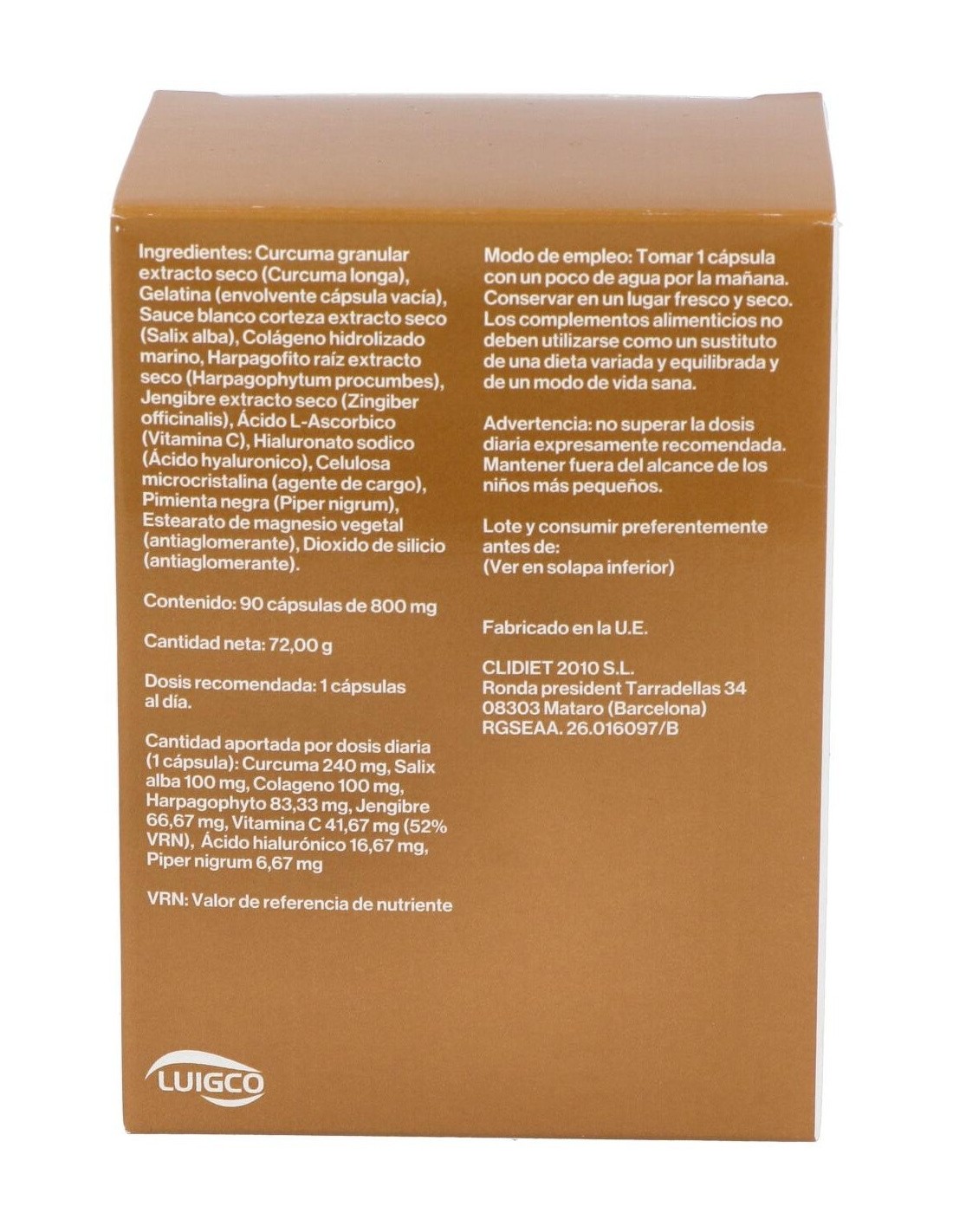 Cúrcuma granular, Sauce blanco corteza, Raíz de harpagofito, Pimienta negra, Ácido hialurónico y colágeno marino hidrolizado.