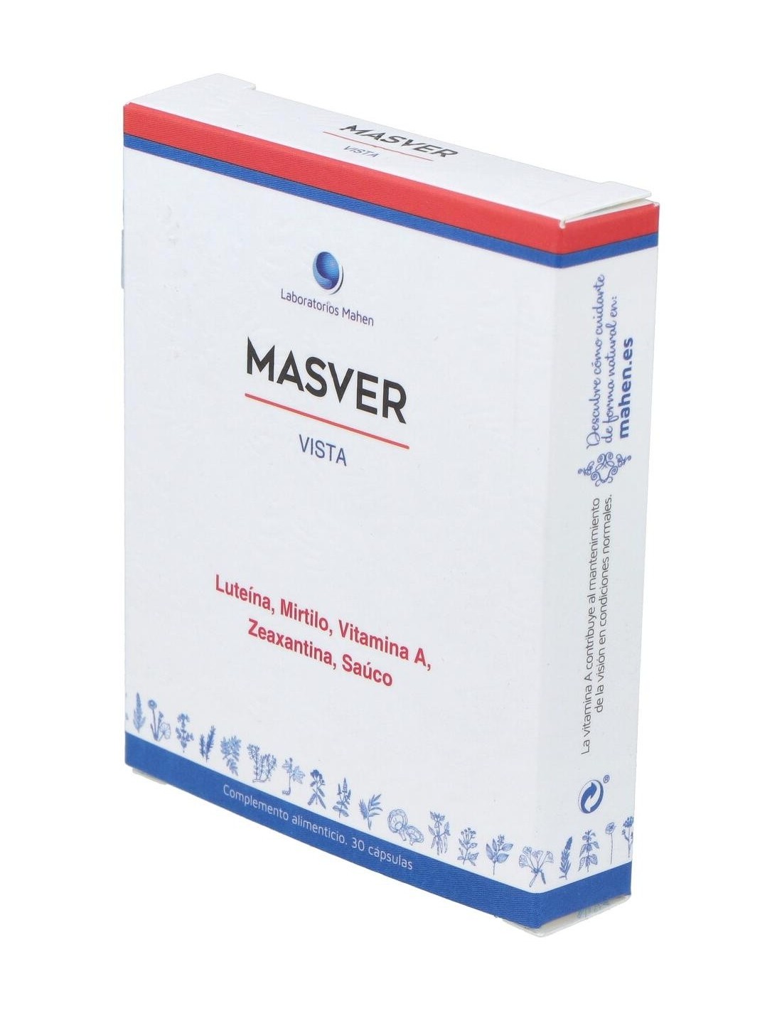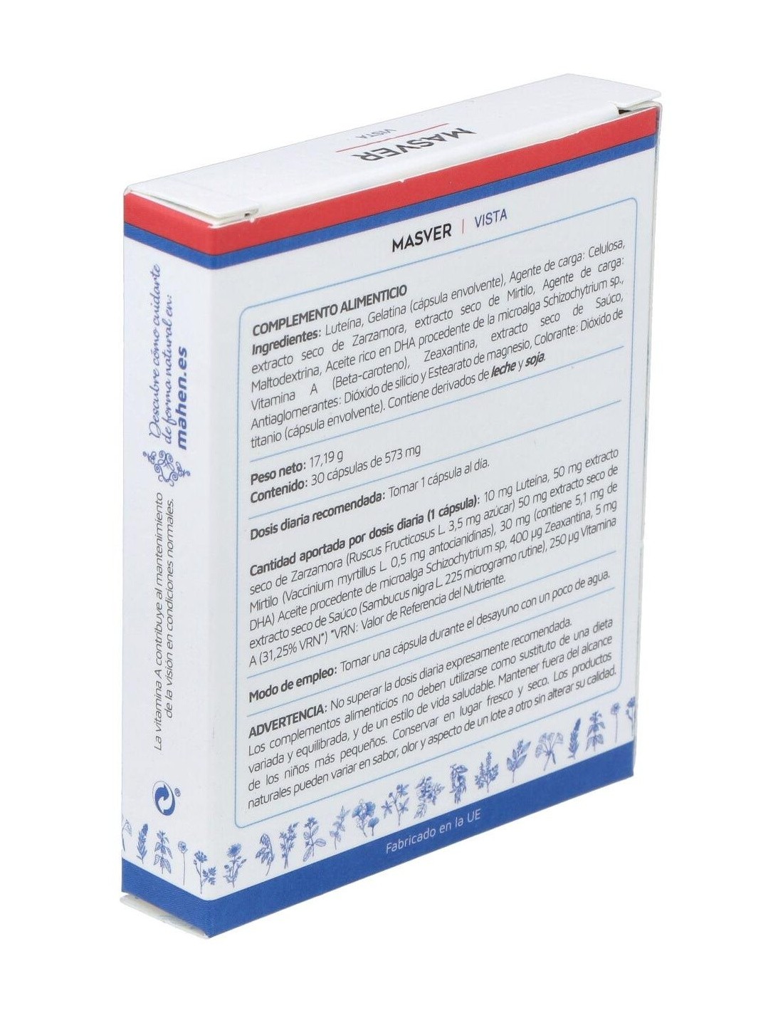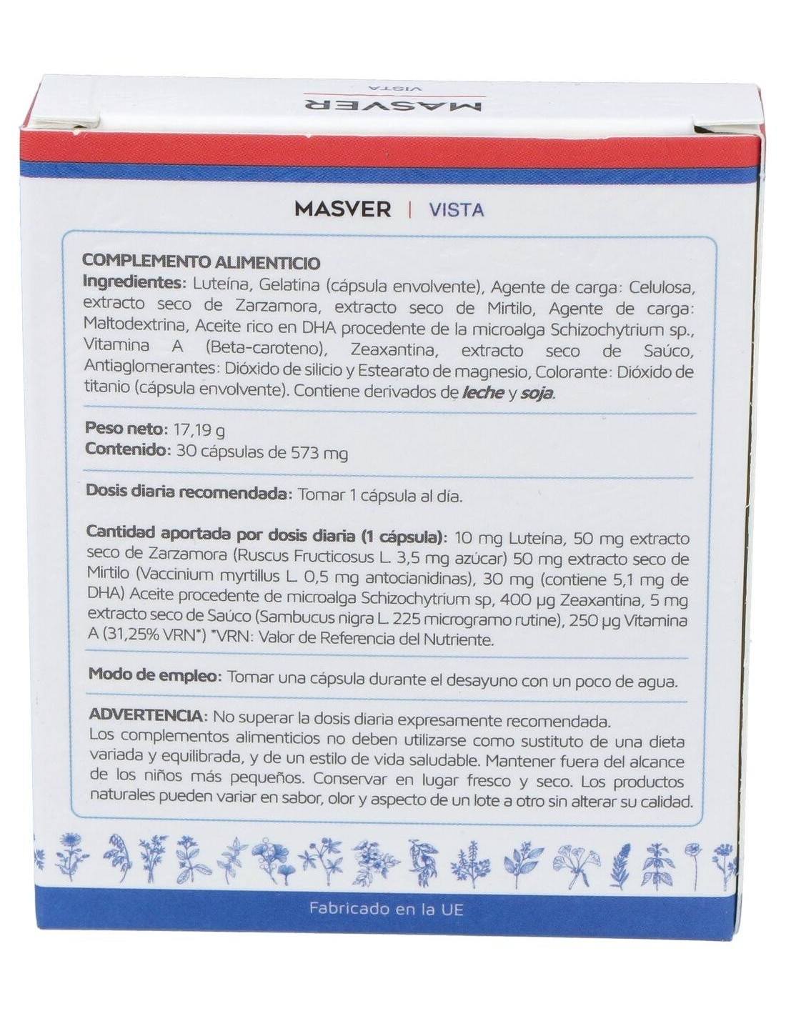 200 mg Luteína al 5%: Gelatina (cápsula envolvente): Agente de carga: Celulosa, 50 mg Extracto seco de Zarzamora (Rubus Fructicosus): 50 mg Extracto seco de Mirtilo (Vaccinium Myrtillus): Agente de carga: Maltodextrina: 30 mg Aceite rico en DHA prodecente de la microalga Schizochytrium sp.: 15 mg Vitamina A (Beta caroteno), 8 mg Zeaxantina al 5%: 5 mg Extracto seco de Saúco (Sambucus Nigra): Antiaglomerantes: Dióxido de Silicio y Estearato de Magnesio: Colorante: E 171 (Dióxido de Titanio) (cápsula envolvente).