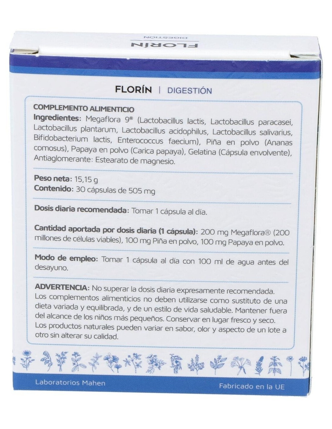 Megaflora 9 (Lactococcus lactis, Lactobacillus paracasei, Lactobacillus plantarum, Lactobacillus acidophilus, Lactobacillus salivarius, Bifidobacterium lactis, Enterococcus faecium), Piña en polvo (Ananas comosus) Papaya en polvo (Carica papaya)