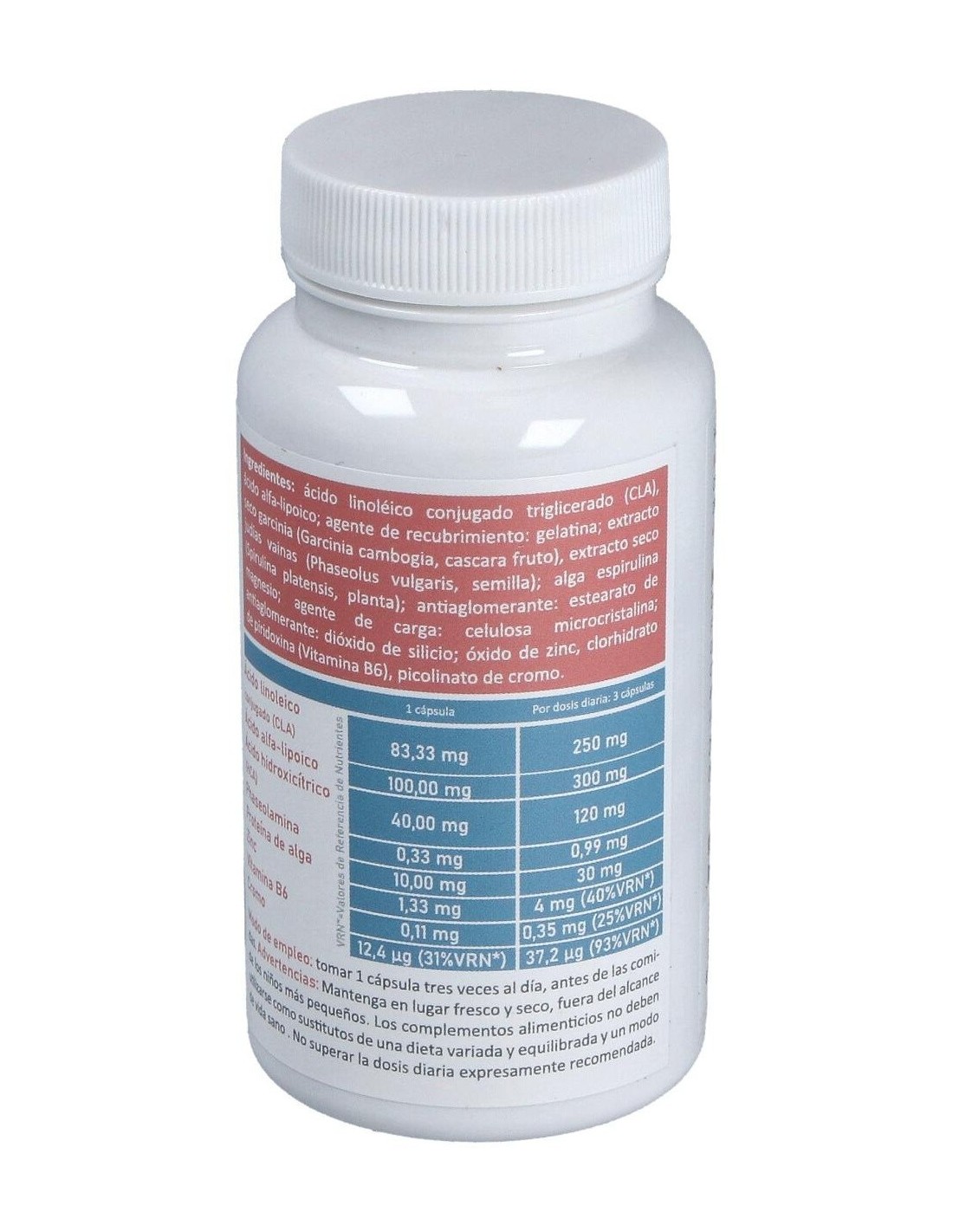 Ácido Linoléico conjugado triglicerado (CLA), ácido alfa-lipoico: agente de recubrimiento: gelatina: extracto seco garcinia (Garcinia cambogia, cascara fruto), extracto seco Judías vainas (Phaseolus vulgaris, semilla), alga espirulina (Spirulina platensis, planta), antiaglomerante. estearato de magnesio, agente de carga: celulosa microcistalina: antiaglomerante. dióxido de silicio: óxido de zinc, clorhidrato de piridoxina (Vitamina B6), picolinato de cromo.