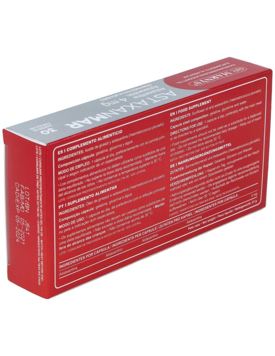 Producto elaborado con Astaxantina natural, a la que se le asocian propiedades antioxidantes, procedente del alga Haematococcus pluvialis. El proceso de extracción de la Astaxantina que lleva a cabo MARNYS® es el método de dióxido de carbono de fluido supercrítico (SFE-CO2) que garantiza el proceso mecánico de ruptura de la pared celular del alga. La extracción mediante SFE-CO2 tiene aproximadamente 3,8 veces más Astaxantina libre, que otros métodos de extracción.