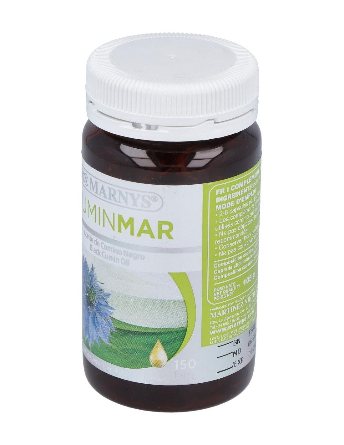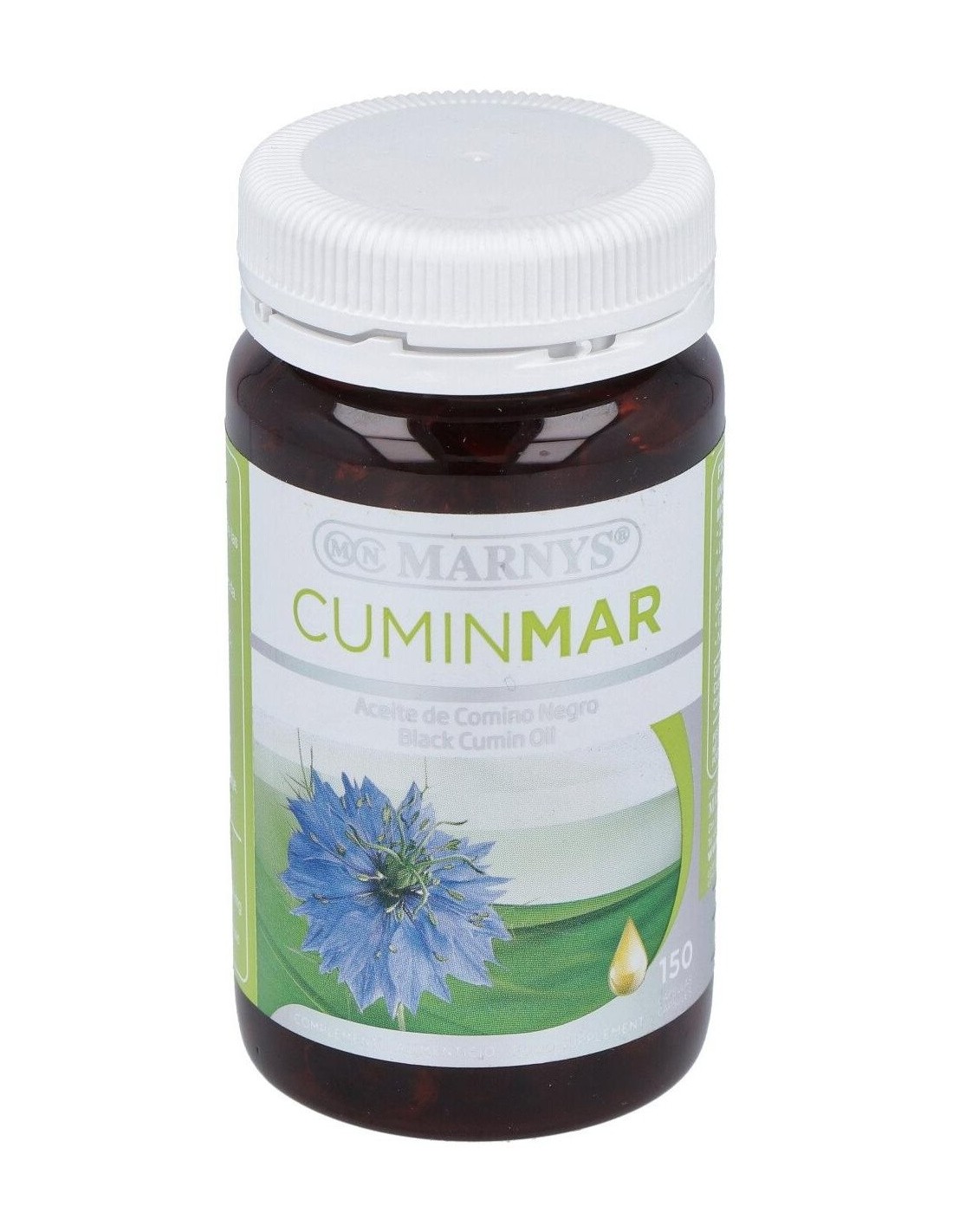 MARNYSCápsulas blandas de aceite de Comino Negro obtenido por prensado en frío, que mantiene su contenido natural de Omega 6 y timoquinona. La Timoquinona es un componente volátil del Comino Negro, del grupo de las benzoquinonas, que ha demostrado efectos antioxidantes y otras interesantes bioactividades.