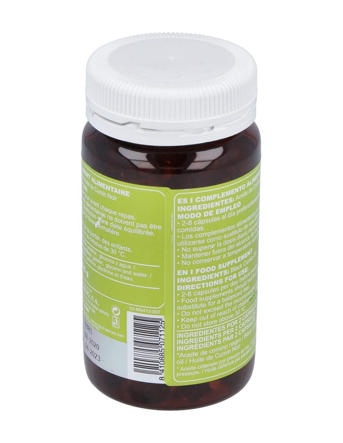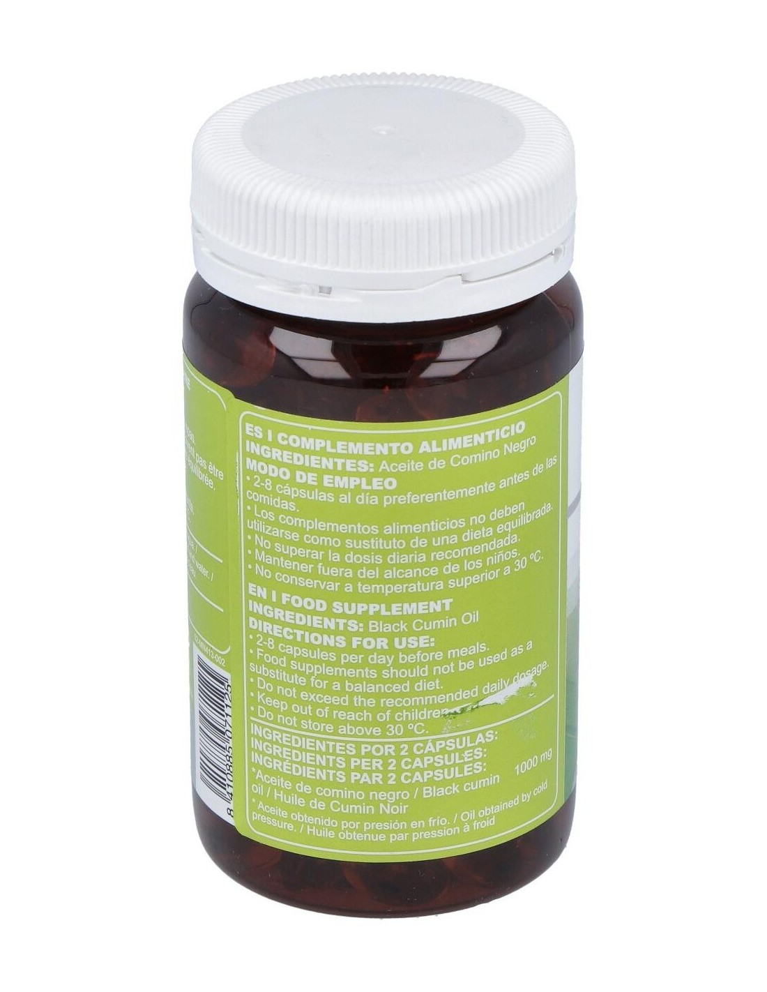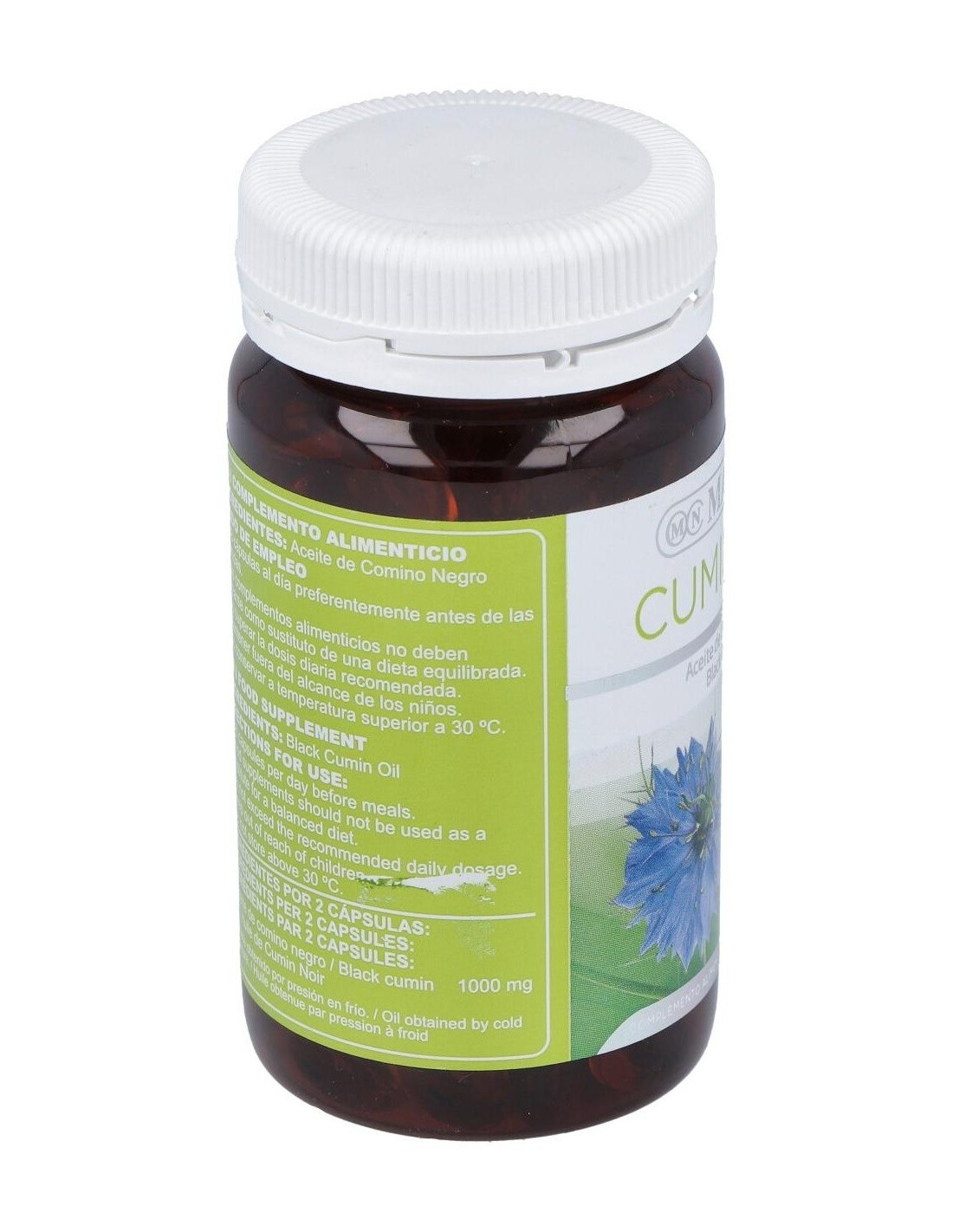 Cápsulas blandas de aceite de Comino Negro obtenido por prensado en frío, que mantiene su contenido natural de Omega 6 y timoquinona. La Timoquinona es un componente volátil del Comino Negro, del grupo de las benzoquinonas, que ha demostrado efectos antioxidantes y otras interesantes bioactividades.