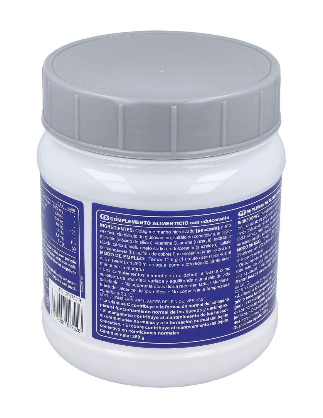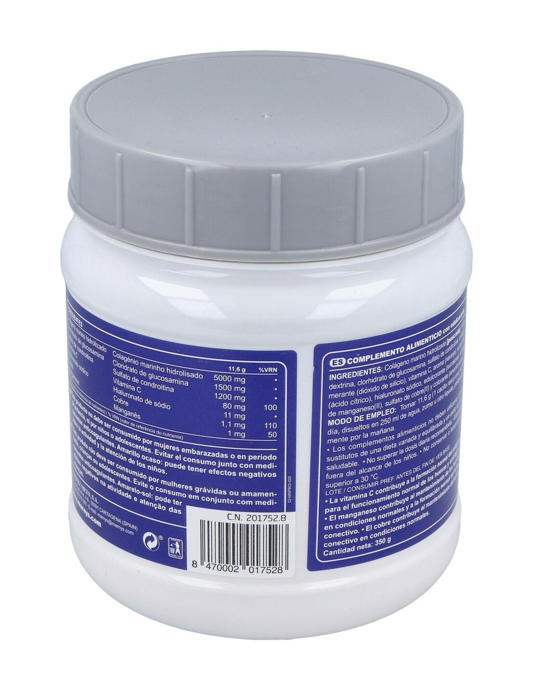 Colágeno Marino Hidrolizado 5000 mg. Clorhidrato de Glucosamina 1500 mg. Sulfato de Condroitina 1200 mg. Vitamina C 80 mg. Hialuronato sódico 11 mg. Cobre 1,1 mg. Manganeso 1 mg.
