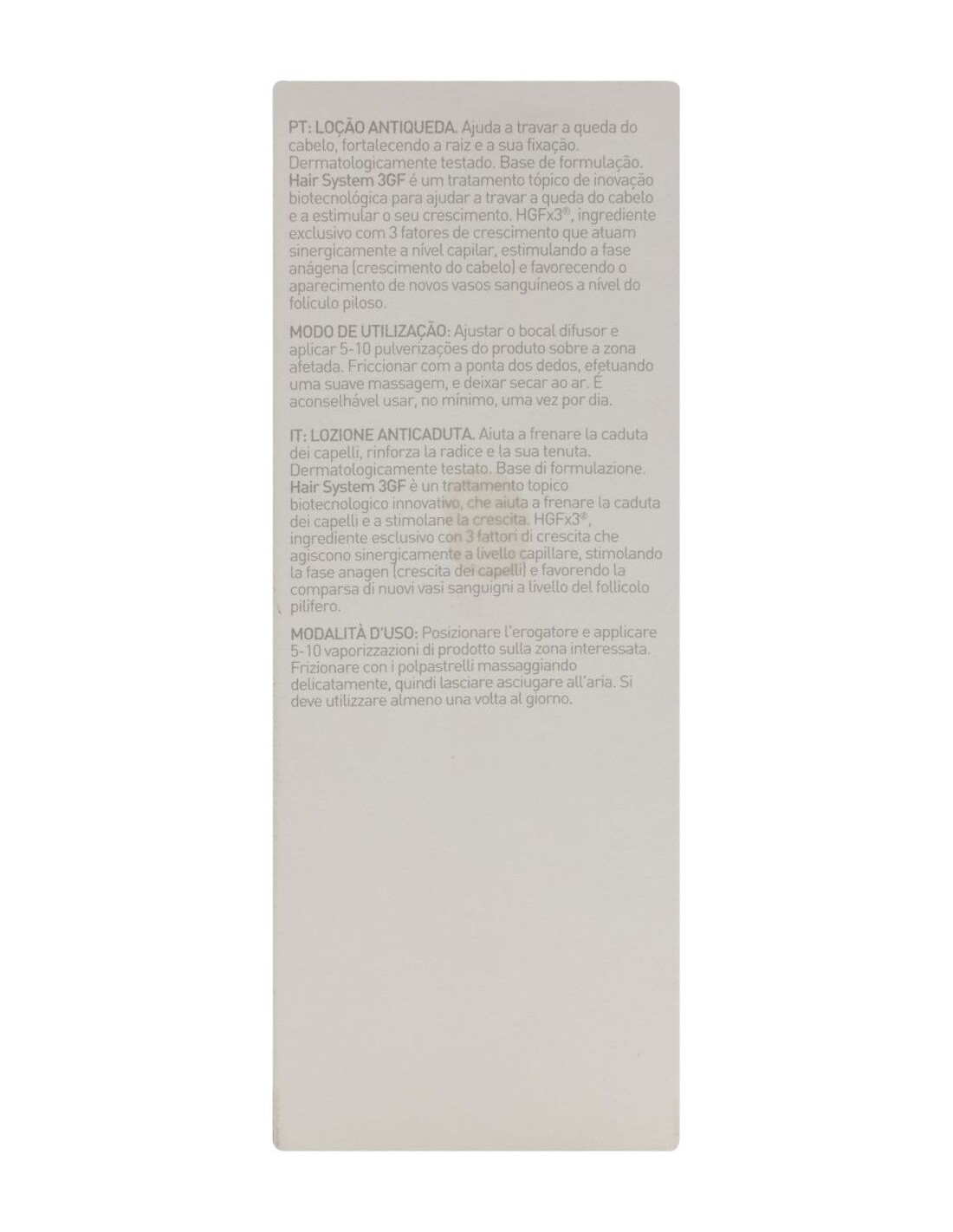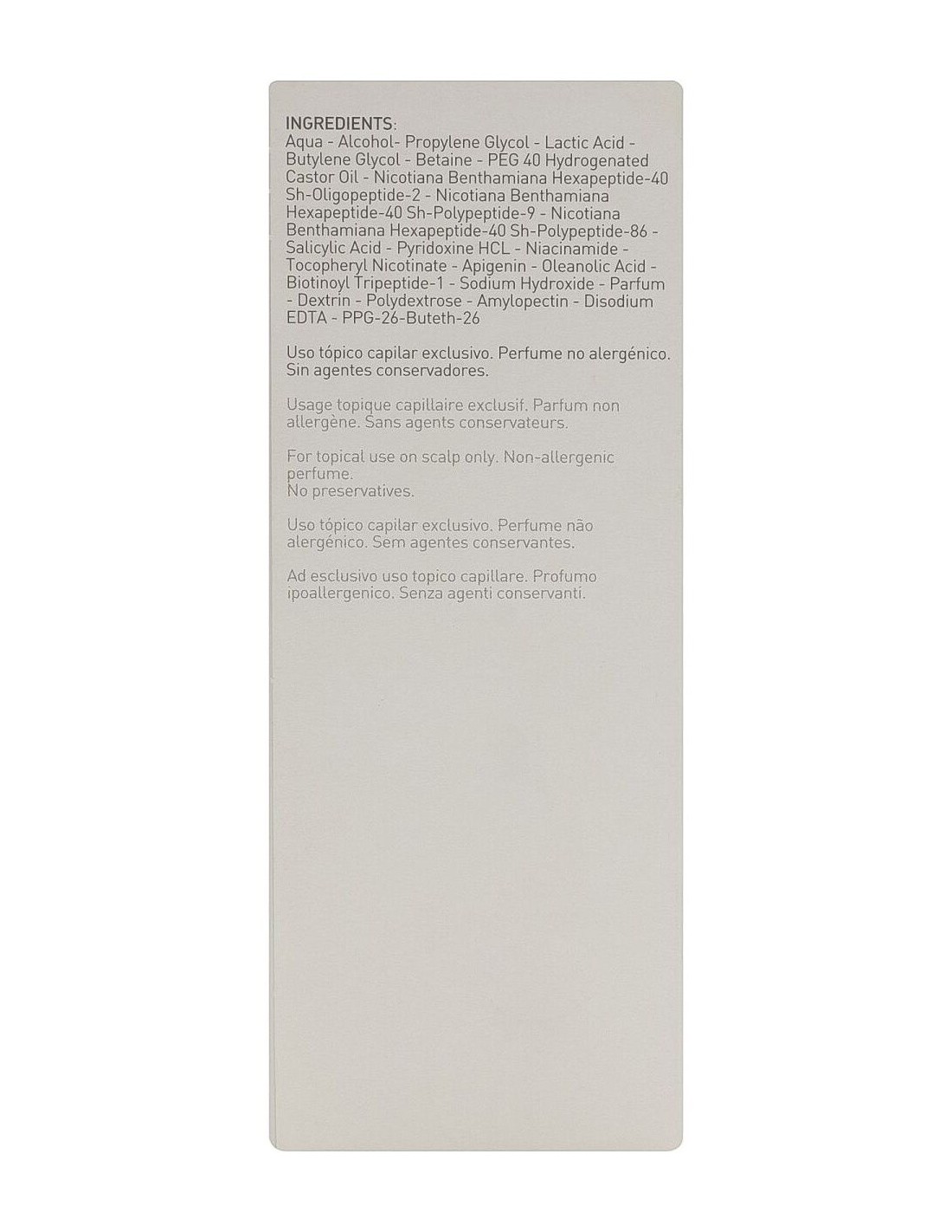 Principales activos:\ HGFx3 (IGF, VEGF, Follistatín)\ Biotinil\ Ácido salicílico\ Nicotinato de tocoferilo\ Piridoxina\ Ácido oleanólico\ Apigenina