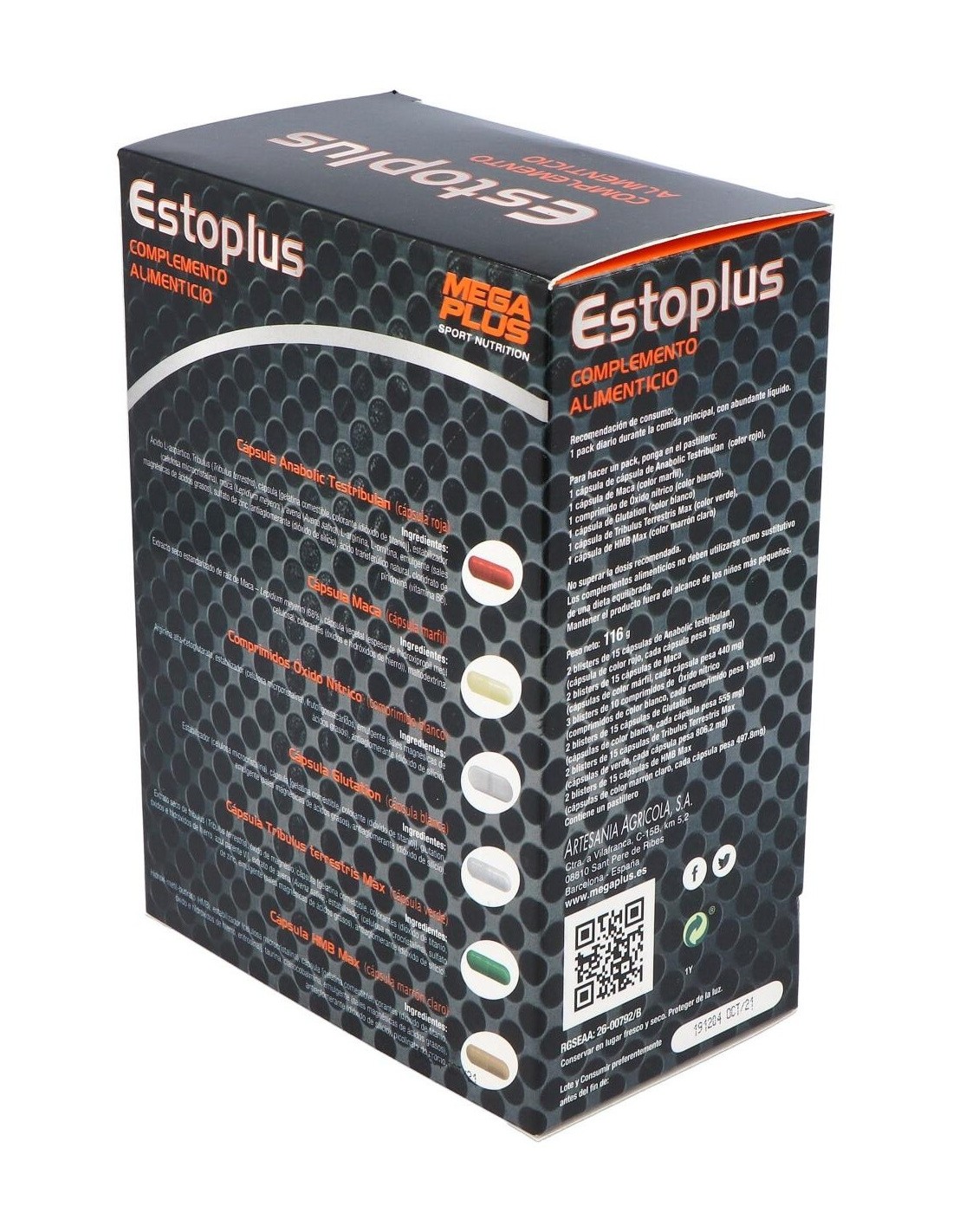 Cada pack contiene: 1 cápsula de Ácido Laspártico (color rojo), 1 cápsula de Maca (color marfil), 1 comprimido de Óxido nítrico, 1 cápsula de Glutation (color blanco), 1 cápsula de Tribulus Terrestris Max (color verde), 1 cápsula de HMB Max (color beig).